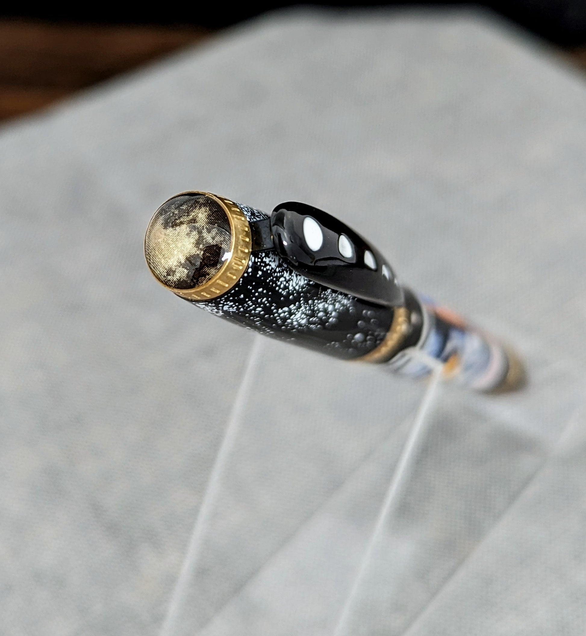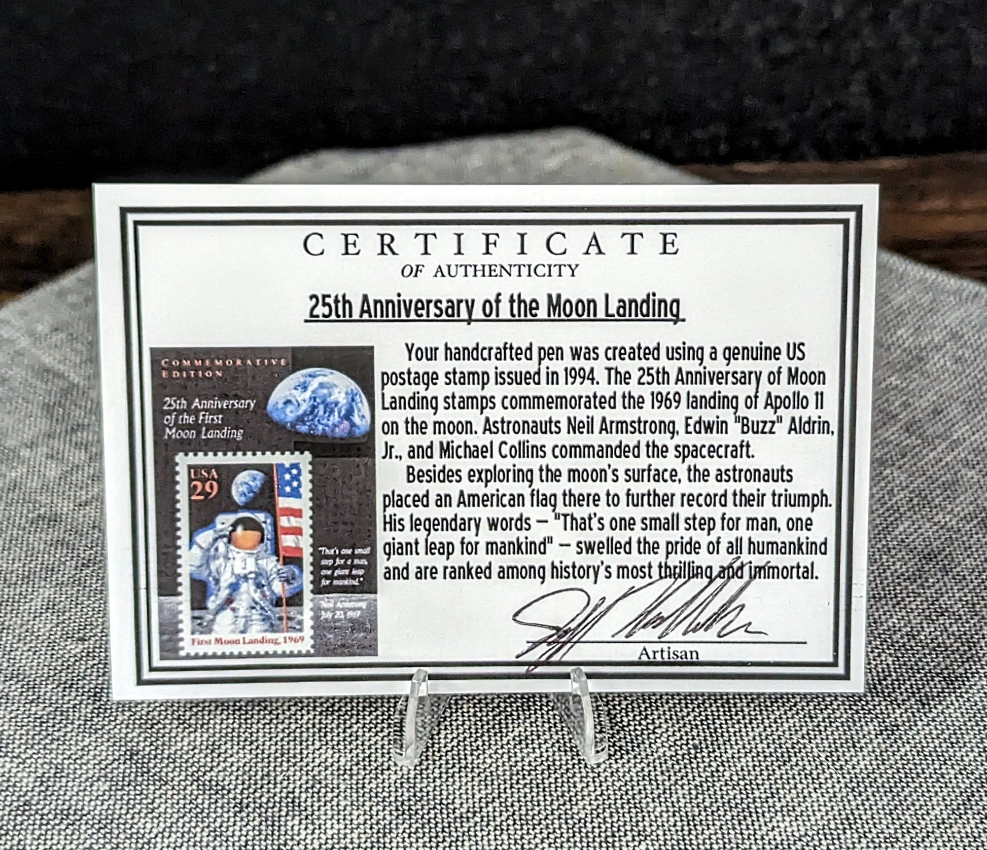 The countdown began, "T-minus 3 2 1..." and with a roar, the engines ignited and they were off! This pen is a remarkable tribute to the historic achievement of Apollo 11. It features a US postage stamp of the mission, paired with matching moon-themed components, which serve as a reminder of the incredible feat that was accomplished. Apollo 11 was the American spaceflight that first landed humans on the Moon, and it was a momentous occasion that will forever be remembered in history. On July 20, 1969, Commander Neil Armstrong and Lunar Module Pilot Buzz Aldrin landed the Apollo Lunar Module Eagle on the surface of the Moon at 20:17, marking a new era in space exploration and human achievement.