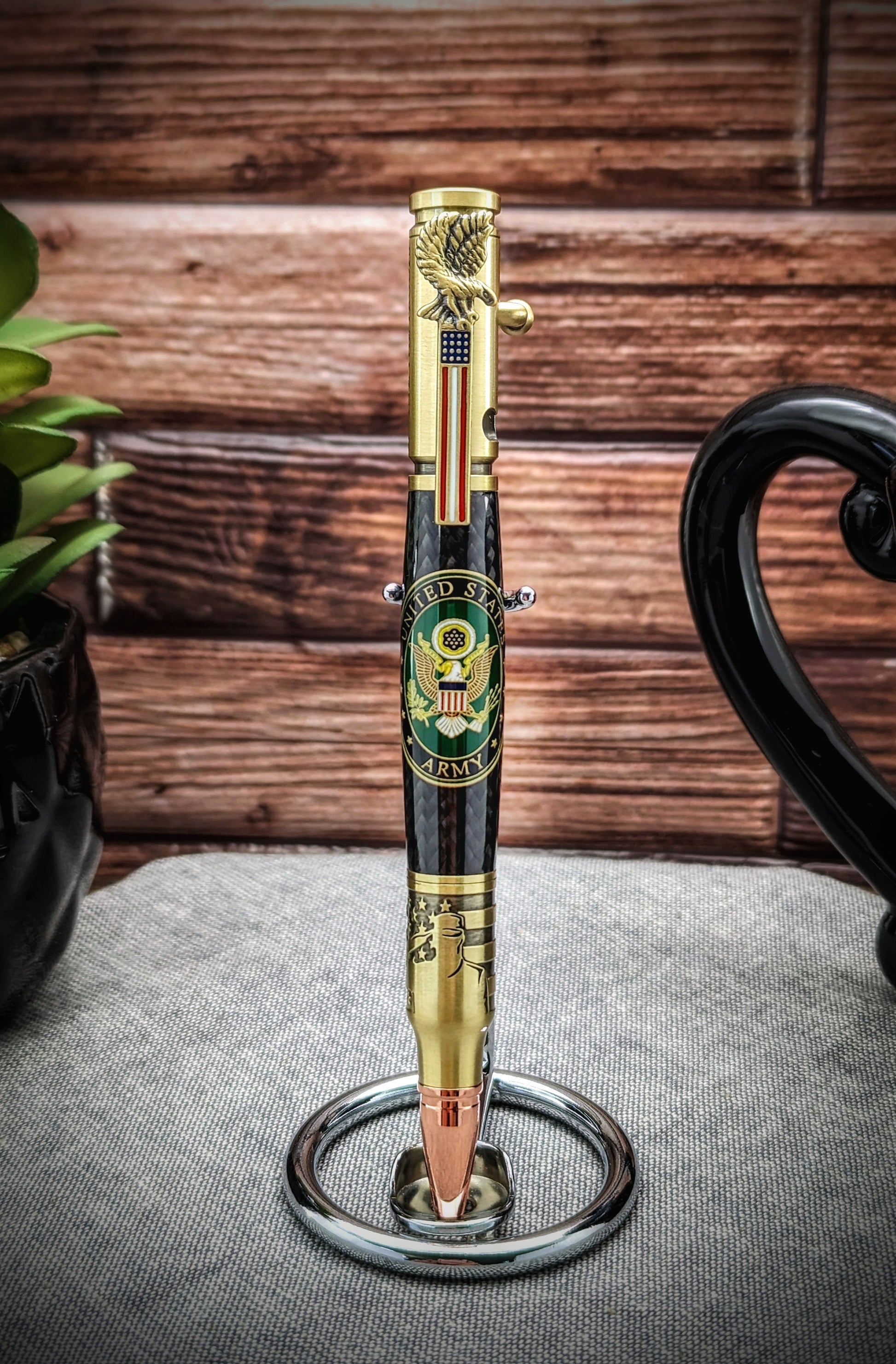 This high-quality pen is a masterpiece of meticulous craftsmanship and attention to detail. The exquisite Army medallion, with its handsome etched engraving of a serviceman saluting and an American flag on the tip. The cap end is stamped with the phrase "Salute the Troops," a powerful message that inspires us to remember the sacrifices made by our brave servicemen and women.
