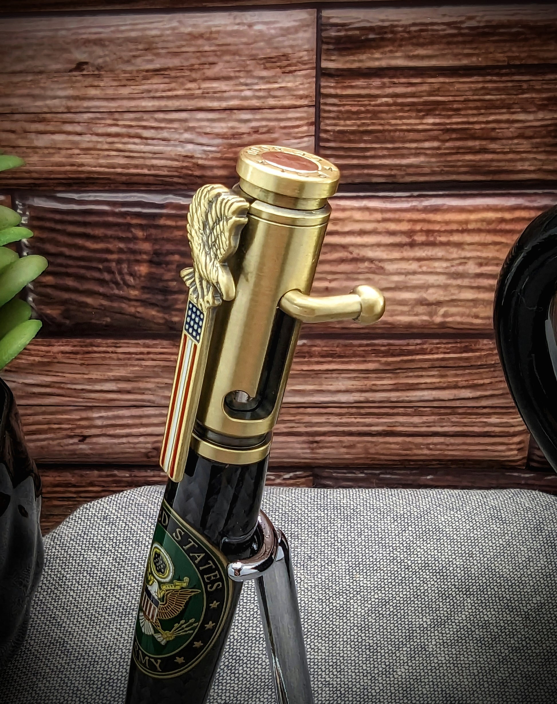 The patriotic theme is continued on the pen clip, which is adorned with a red, white, and blue American flag and a beautifully cast Bald Eagle emblem. The antique brass finish gives the pen an authentic and rustic look, as if it has been passed down through generations of proud American families.