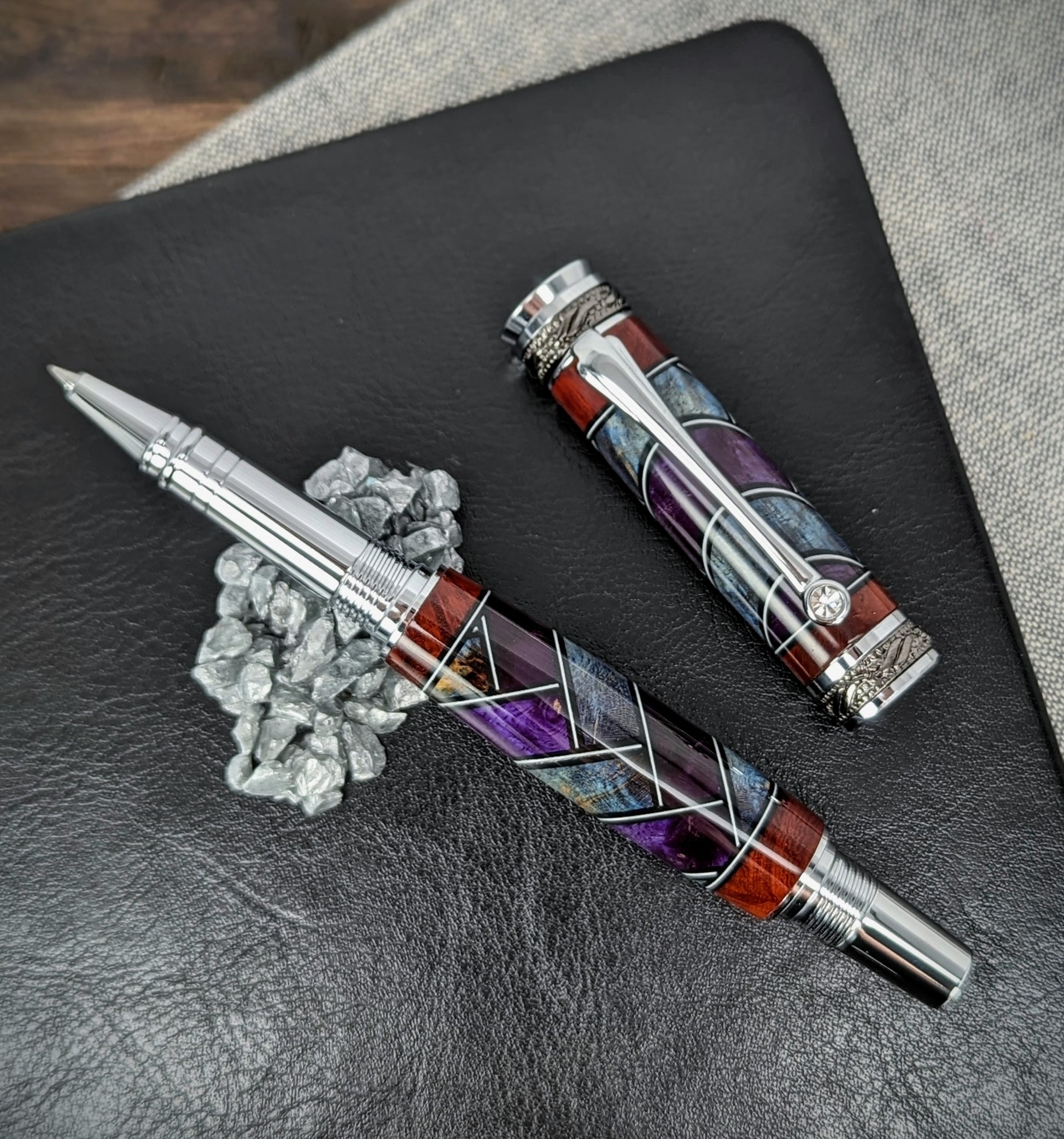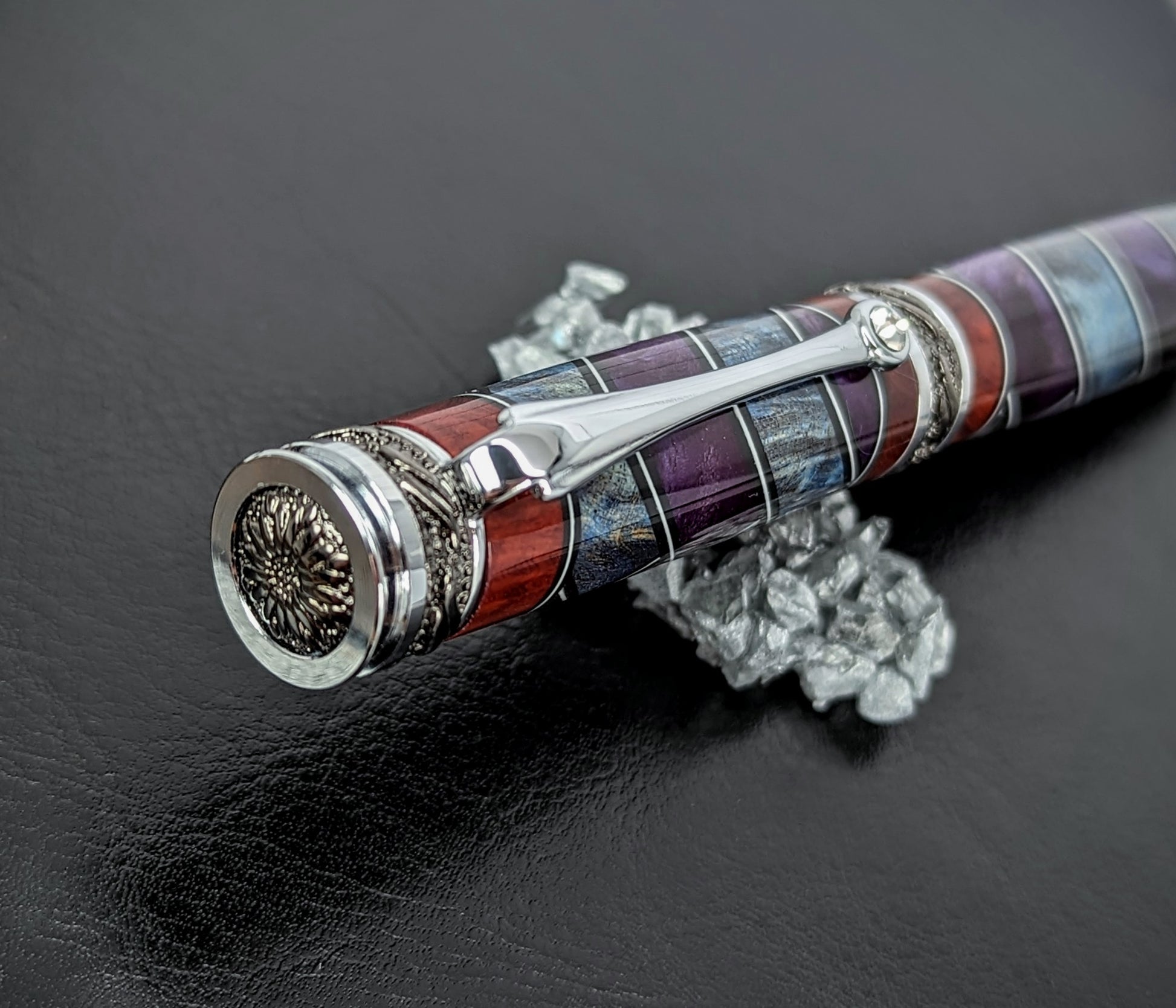 Take a moment to appreciate the sheer magnificence of this pen. Its dark, rich wood is a feast for the eyes, and the regal colors of deep purple and blue are sure to leave you spellbound. The pen clip is adorned with a sparkling Swarovski clear crystal, adding a touch of glamour to the already stunning design. But the beauty doesn't stop there - every exposed accent ring, band, and cap has been meticulously hand-carved with intricate three-dimensional designs, elevating this pen to a level of elegance that is truly unmatched.
