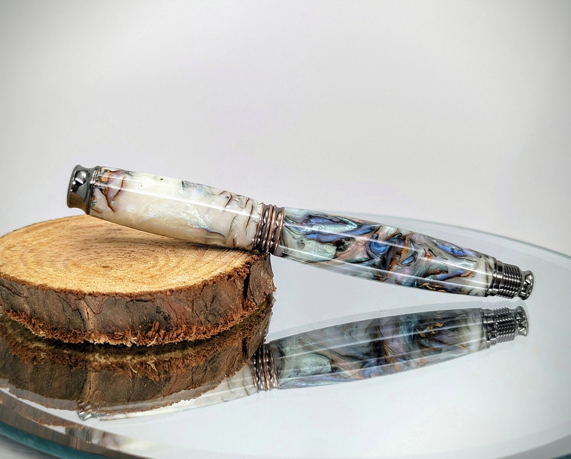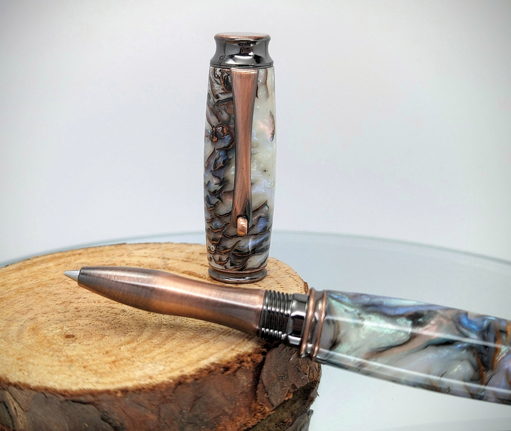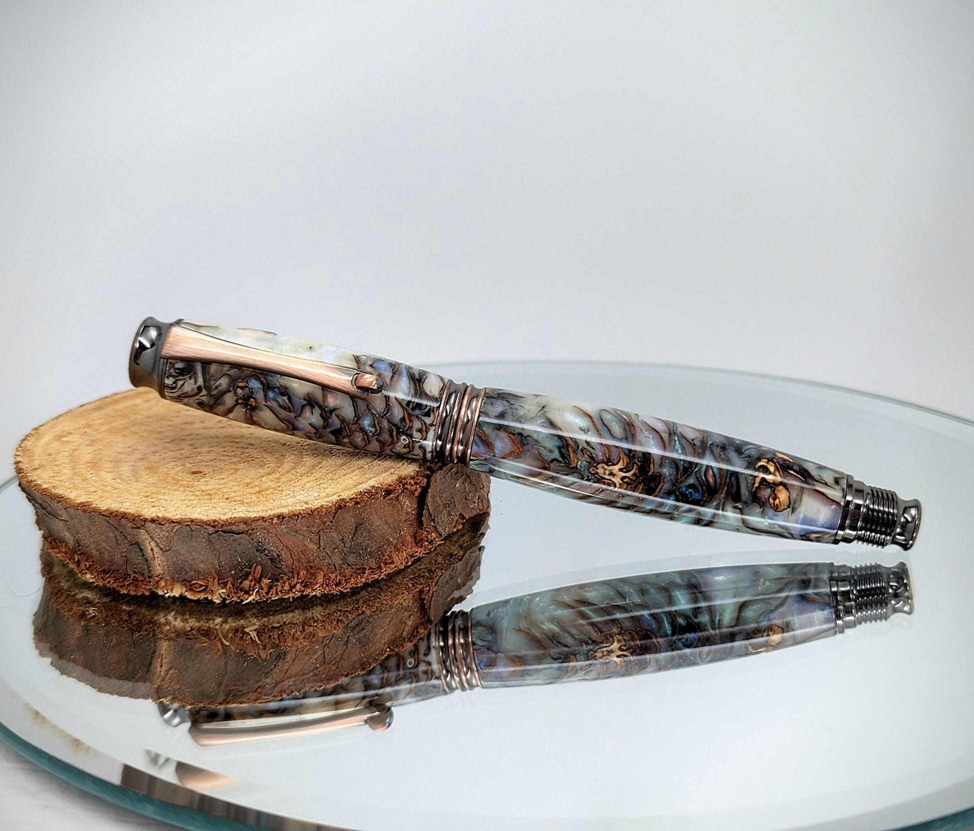 Discover elegance and nature intertwined in our Copper Rollerball Pen. Cast with real pine cone in a faux abalone resin blend, it's a mesmerizing blend of natural beauty and sophistication. Effortlessly smooth writing meets stunning design—a perfect gift or indulgence for those who appreciate the extraordinary.