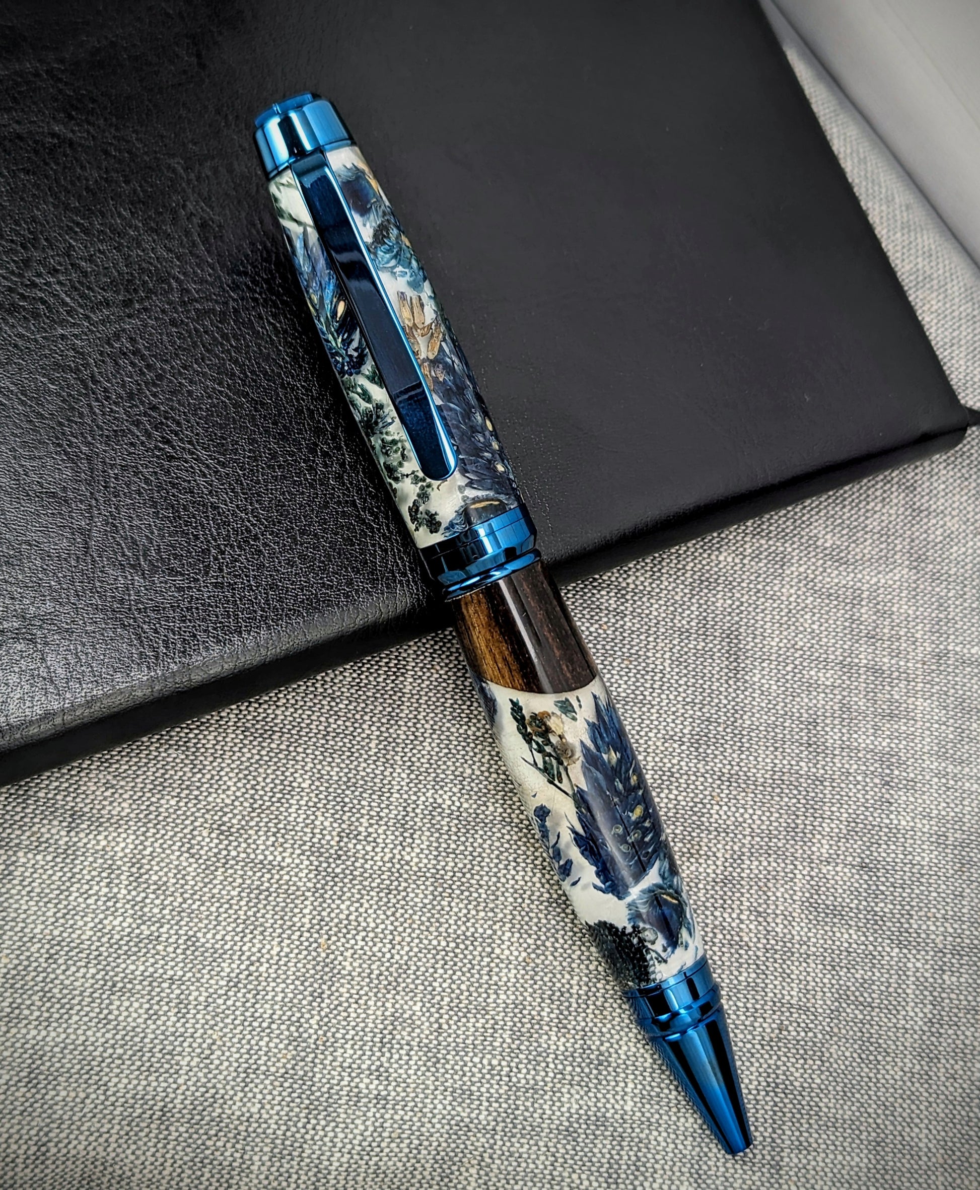 This beautiful pen, featuring a captivating blue flower cast against dark wood with blue Titanium plating. Unlike most ballpoint versions, it offers larger grip and weight, ensuring durability and elegance in every stroke.