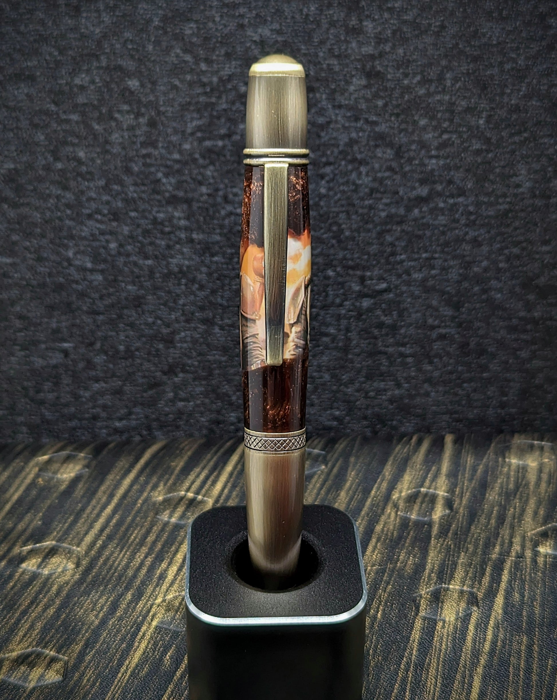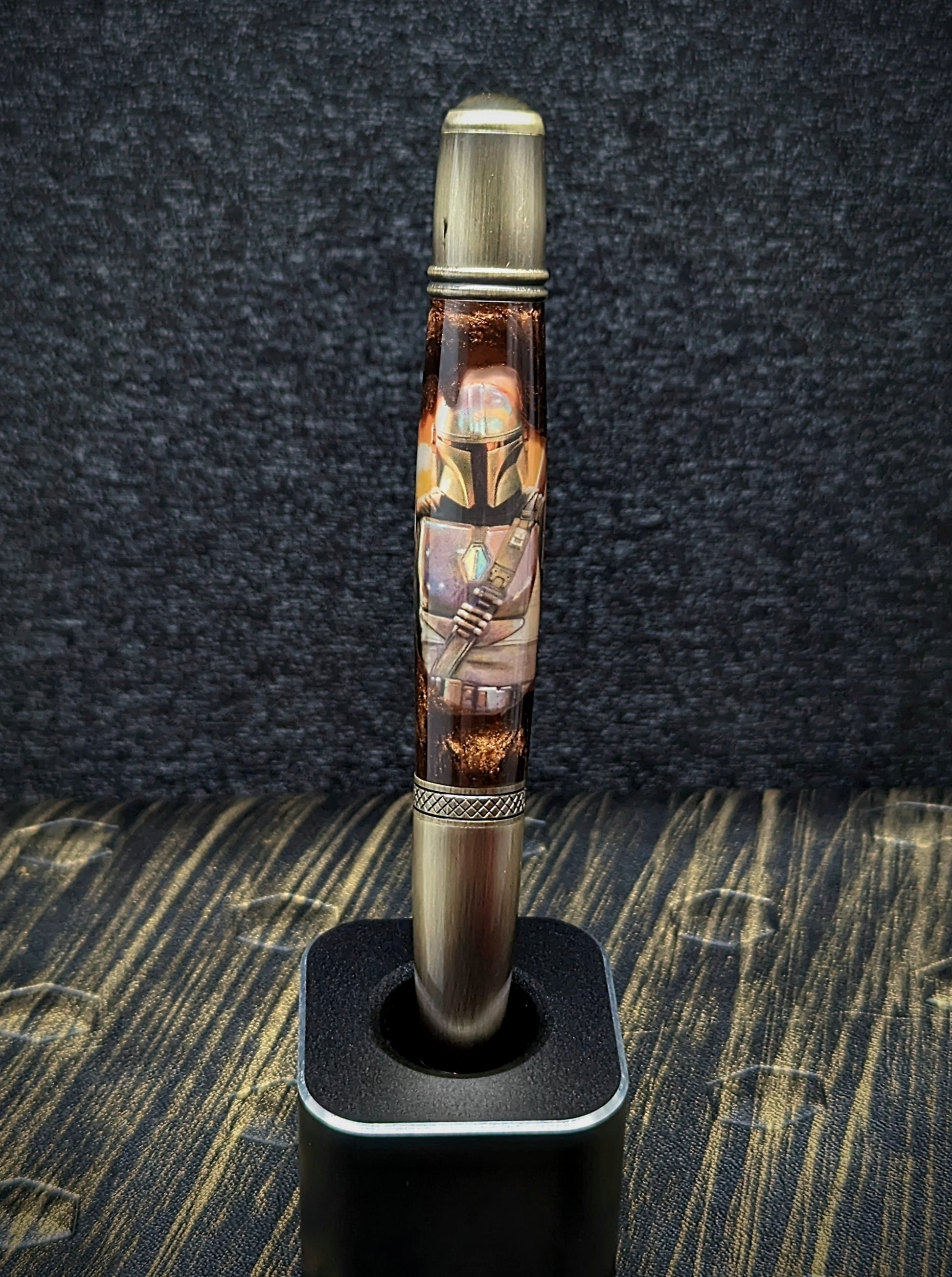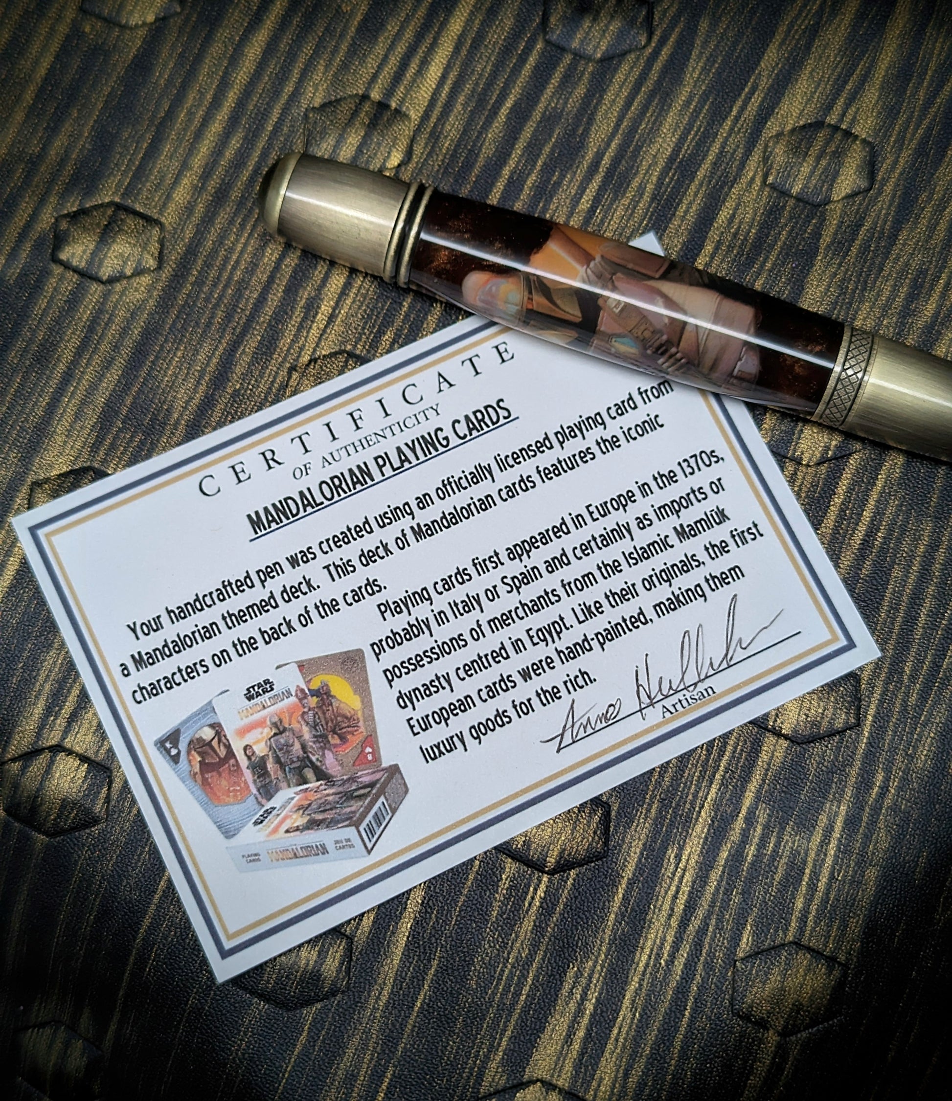 "Introducing our exclusive Mandalorian-themed playing card pen, the ultimate accessory for any Star Wars fan and pen enthusiast alike! Crafted from a genuine playing card featuring iconic imagery of The Mandalorian, this pen seamlessly merges style and functionality.