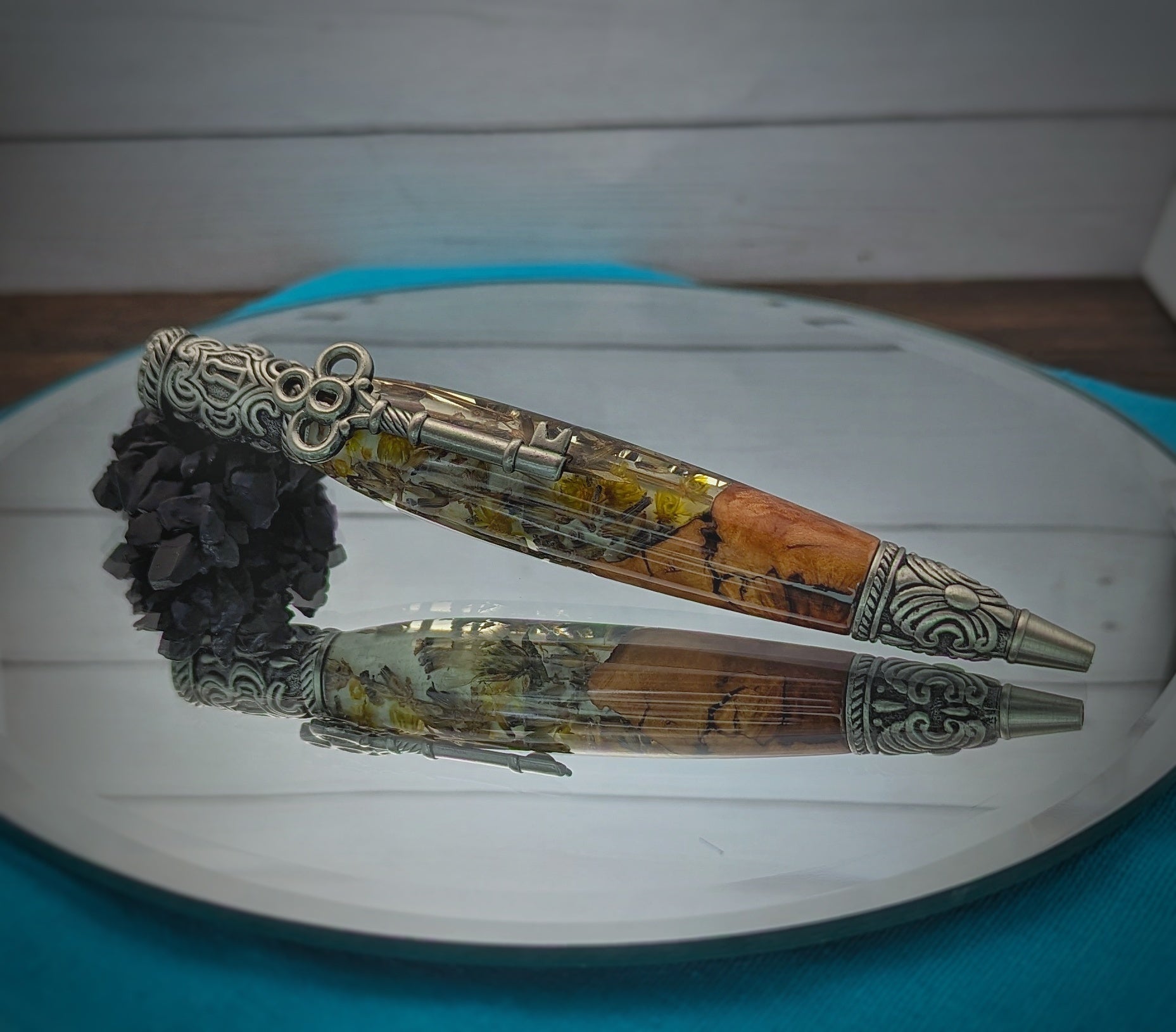 The beauty of this pen is truly exceptional. Its captivating skeleton key aesthetic and unique twist design are sure to catch anyone's eye. The stunning floral patterns and burl accents harmonize perfectly, creating a composition that is both beautiful and one-of-a-kind. The clip's unique key design adds even more character to this impressive pen. The ornamental detailing on the nib and top finial keyhole elevate this pen to a level of elegance and sophistication that is unmatched. With top-quality Antique pewter hardware, this pen is not only beautiful but also built to last and function with durability. It's a true masterpiece of design and craftsmanship, a must-have for those who appreciate the finer things in life.