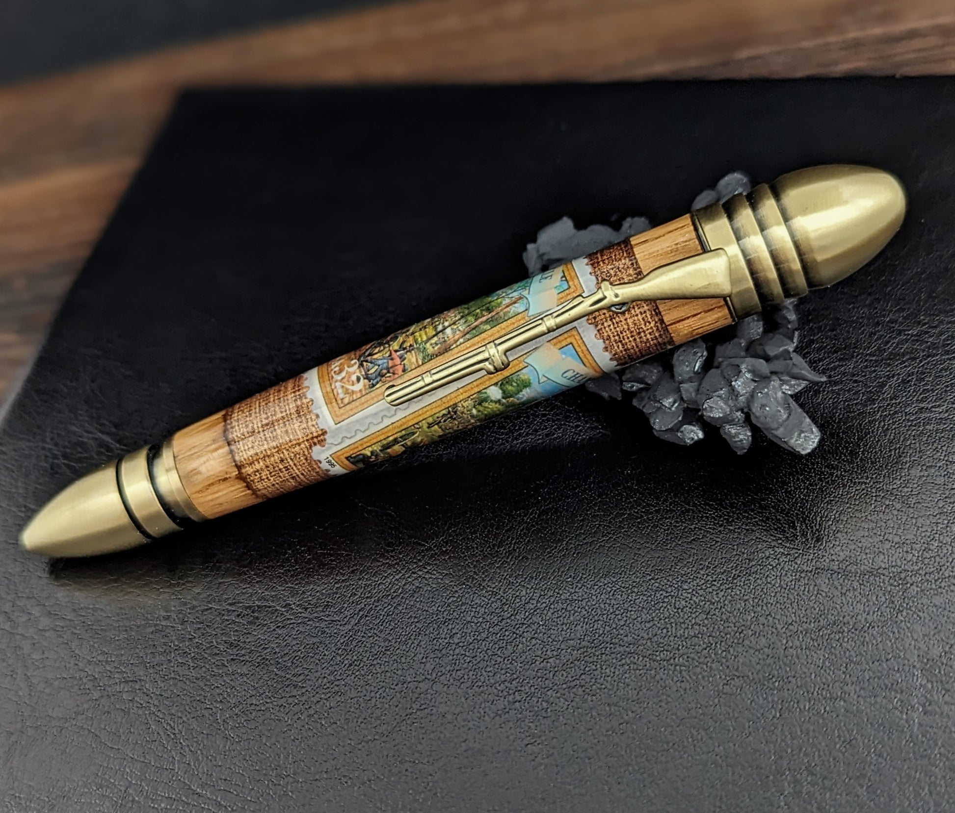 This pen is a tribute to the 1861 Springfield Rifle Musket clip, with a replica 58 Caliber Minie' Ball on the cap and a 44 Colt Army Bullet on the end. The attention to detail is remarkable, and the pen is a perfect gift for Civil War enthusiasts, gun aficionados, history buffs, and outdoorsmen. With this unique and inspiring pen, you can create your own chapter of history and feel the weight of the past in your hand.