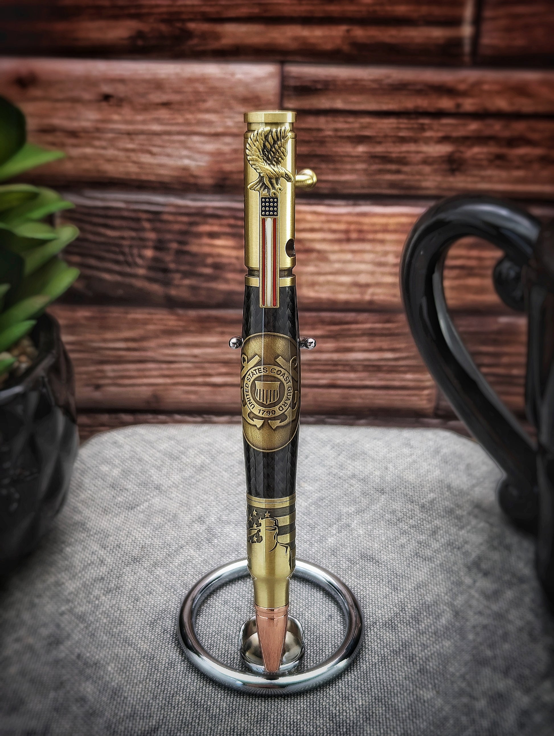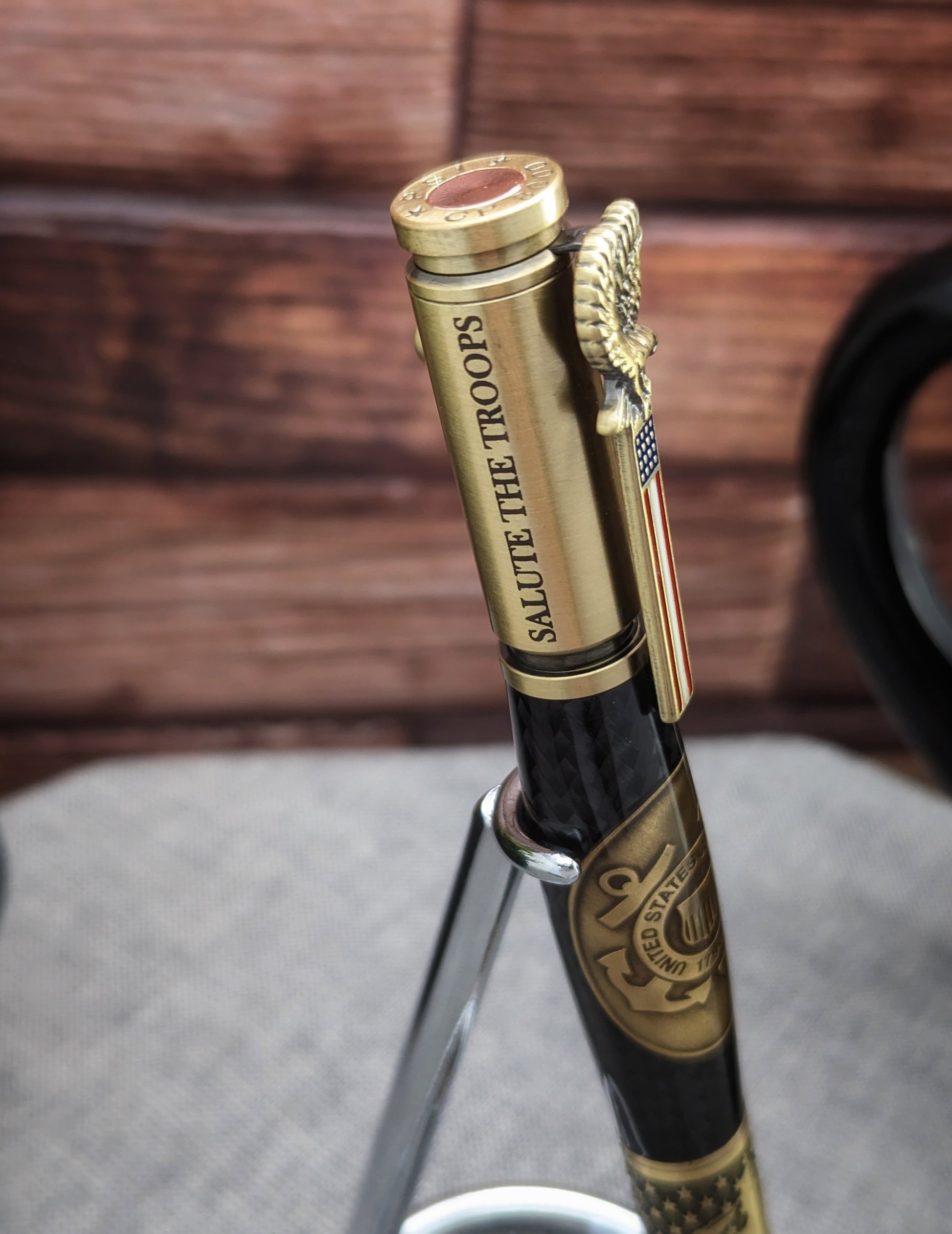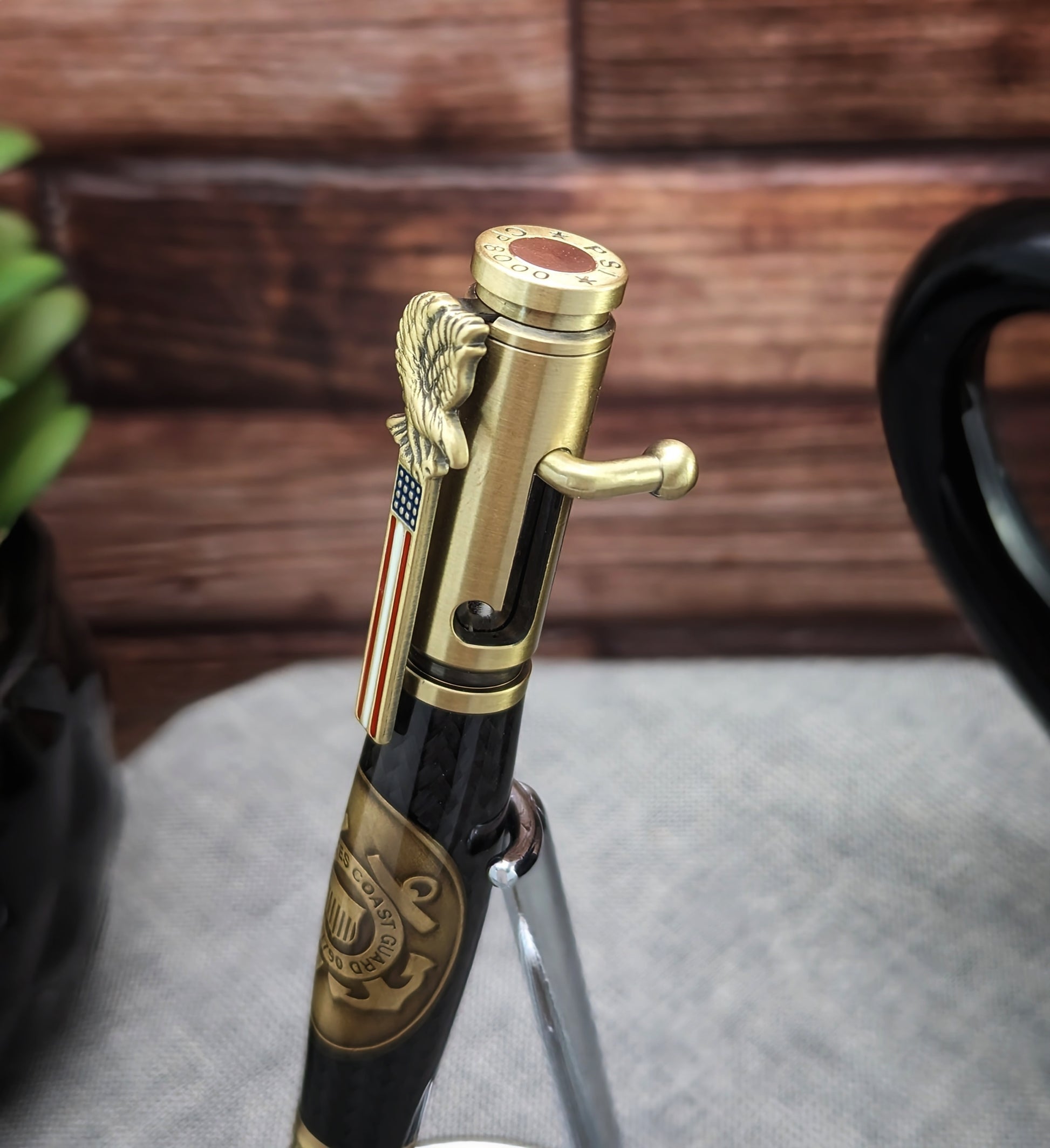 Every stroke of this pen is an act of gratitude towards our troops. It's a symbol of respect for their selfless service and sacrifices made for our country. This top-quality pen is a masterpiece of meticulous craftsmanship and attention to detail. The exquisite Coast Guard medallion, with its handsome etched engraving of a serviceman saluting and an American flag on the tip, along with the Bald Eagle emblem on the pen clip, will inspire you to remember the sacrifices made by our brave servicemen and women. The antique brass finish gives the pen an authentic and rustic look, reminding us of the generations of proud American families who have served before us. With the phrase "Salute the Troops" stamped on its cap end, this pen is a powerful message that calls us to action. Take a hold of this pen, and let every stroke be a tribute to our heroes.
