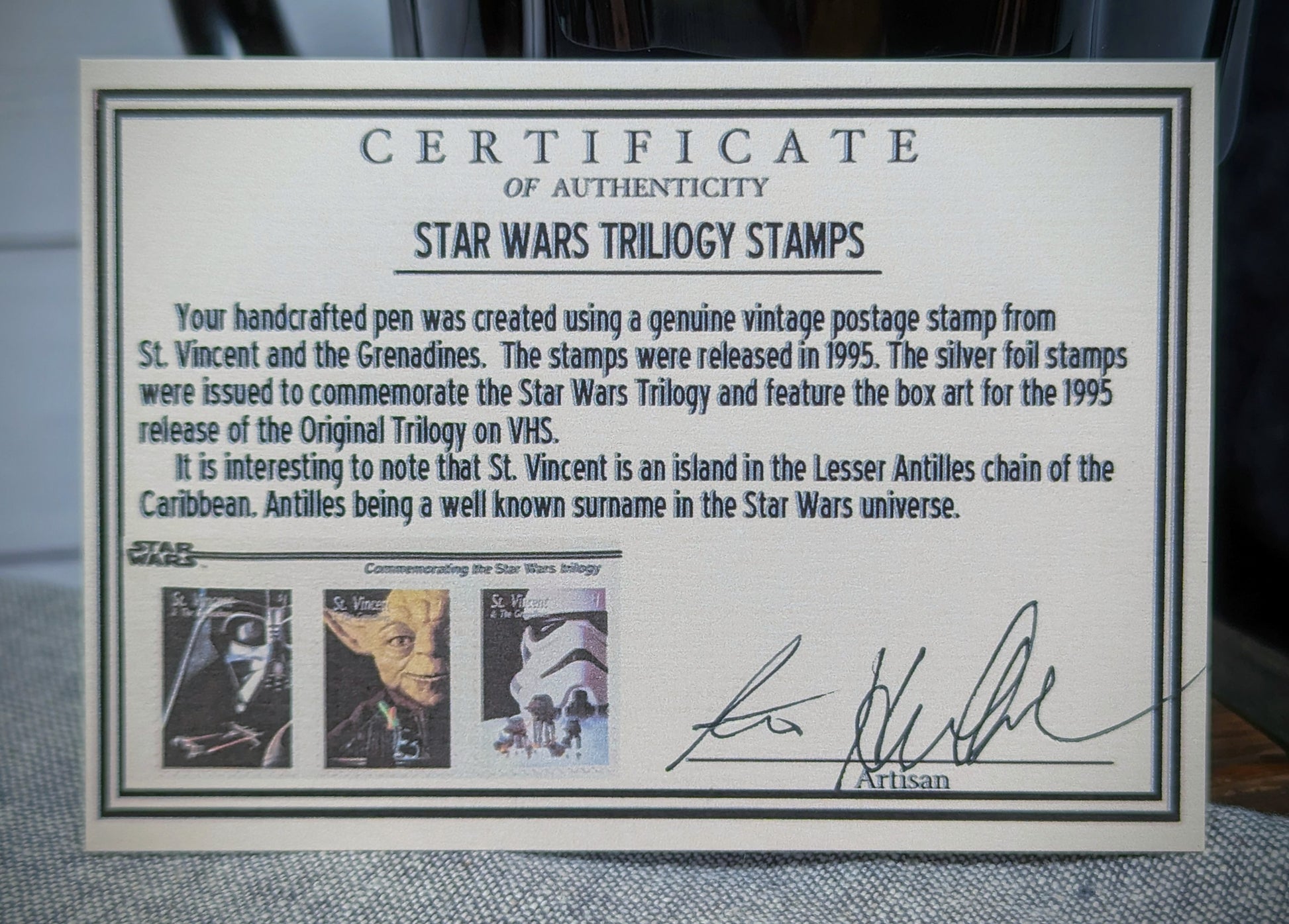 The Rollerball Pen's black resin finish has an enchanting quality that evokes the mesmerizing allure of the galaxy. Its design pays tribute to Darth Vader, an iconic character from the Star Wars Trilogy, through a vintage postage stamp from St. Vincent and the Grenadines. This unique collector's item was meticulously crafted with precision and care to ensure a seamless and perfectly balanced writing experience. Its elegant design draws inspiration from the picturesque St. Vincent, located in the Caribbean chain's Lesser Antilles. The pen's splendid design sparkles in the light, demanding attention and displaying its timeless beauty. Its intricate knurling and minimalist style make it a valuable addition to any pen collection, constructed with only the highest quality components and designed to last a lifetime.