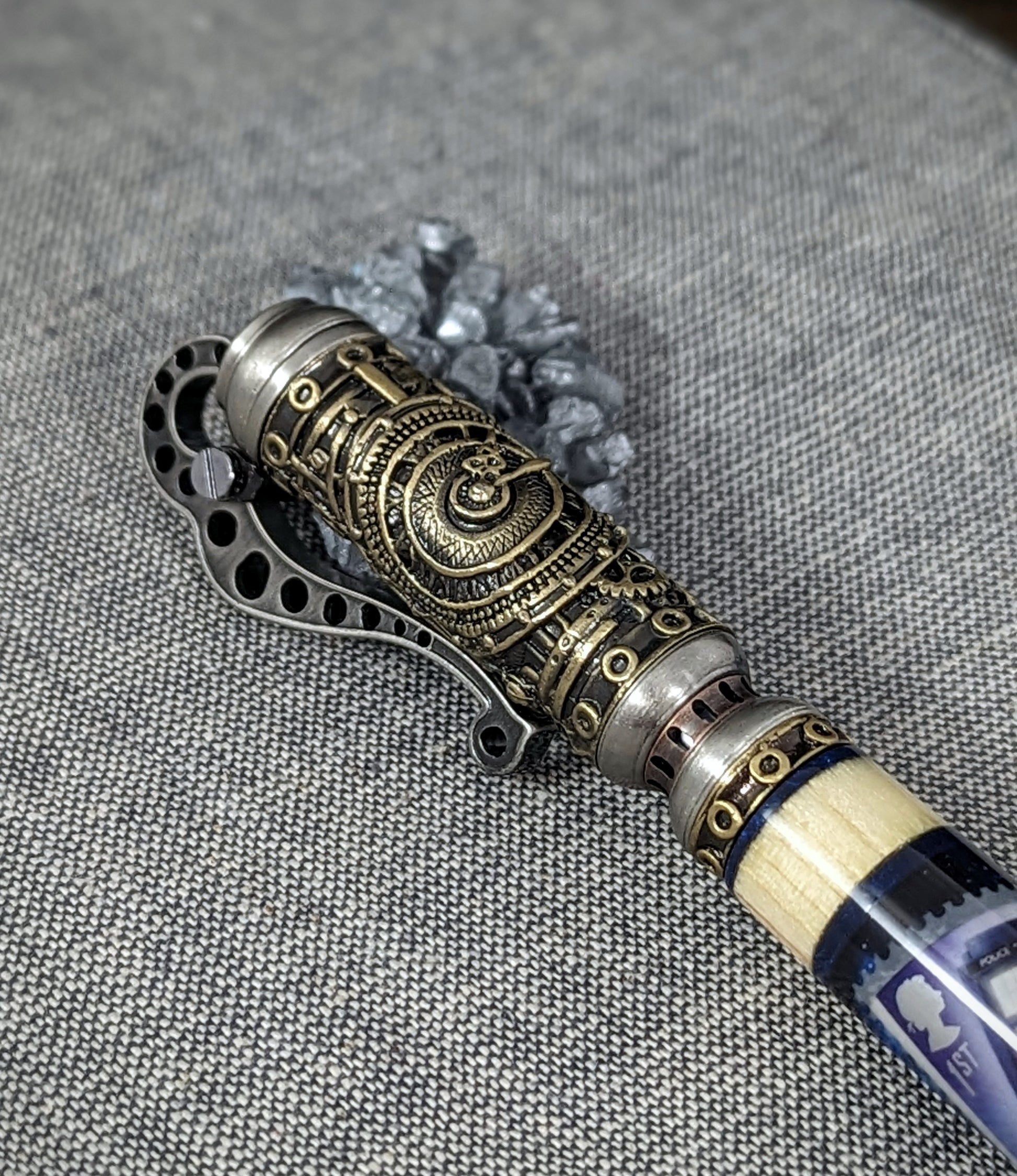 Attention all Doctor Who fans! You won't want to miss out on this one-of-a-kind pen. Made from authentic TARDIS wood, this pen is a true collector's item. The intricate metal working of the collectible TARDIS stamp in Antique Brass and Antique Pewter steampunk style clockwork is a nod to the show's unique aesthetic. Don't miss your chance to own a piece of Doctor Who history with this must-have pen.
