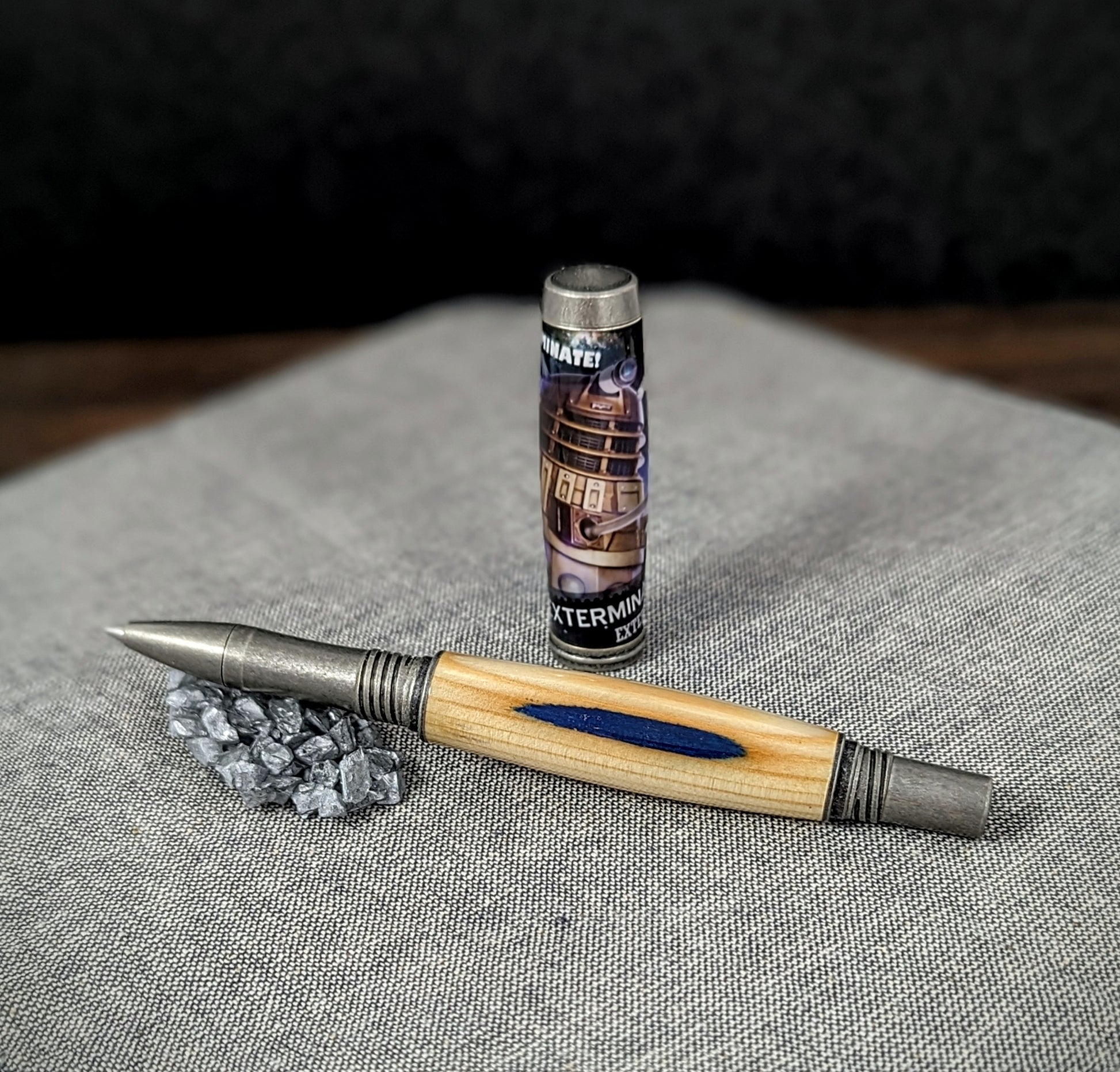 This collectible pen is a must-have for every dedicated Doctor Who fan. With its antique silver metal parts and a cap featuring a collectible stamp of one of the Doctor's most fearsome foes - the Dalek - this pen is a true work of art. What makes it even more special is its body, which is crafted using wood sourced from the actual TARDIS - the Doctor's legendary time and space-traveling police box. The pen is not just a writing instrument, it is a symbol of inspiration and imagination. The Doctor, a Time Lord from the planet Gallifrey, is the epitome of resilience and courage, having survived the devastating war against the Daleks. With this pen, you can channel that same spirit of adventure and tenacity, and let your creativity take flight. Don't miss out on the chance to own a piece of Doctor Who history - add this collectible pen to your collection today!
