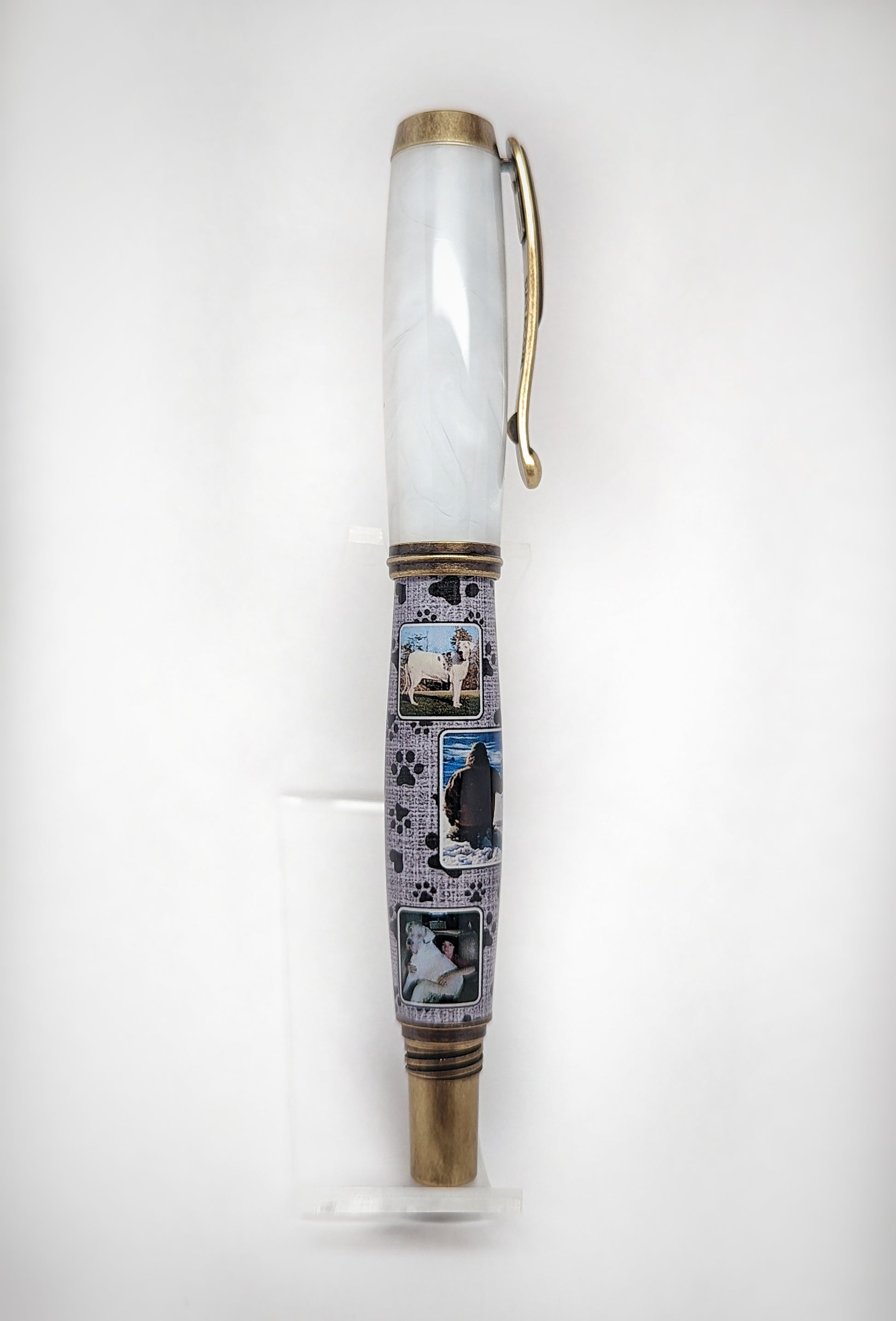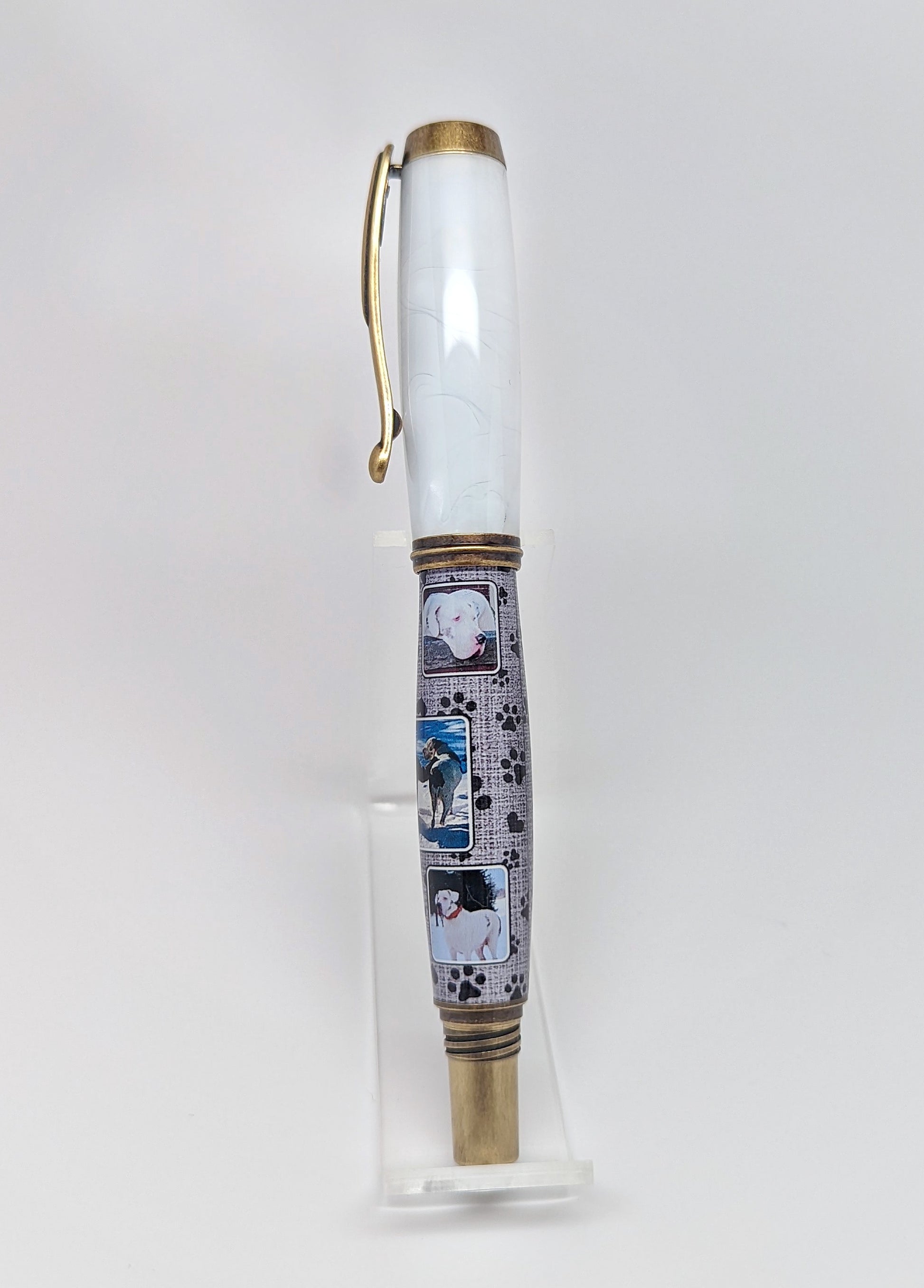 Handcrafted with images of a beloved furry family member. Completed with an custom engraved 18-karat gold fountain pen nib.