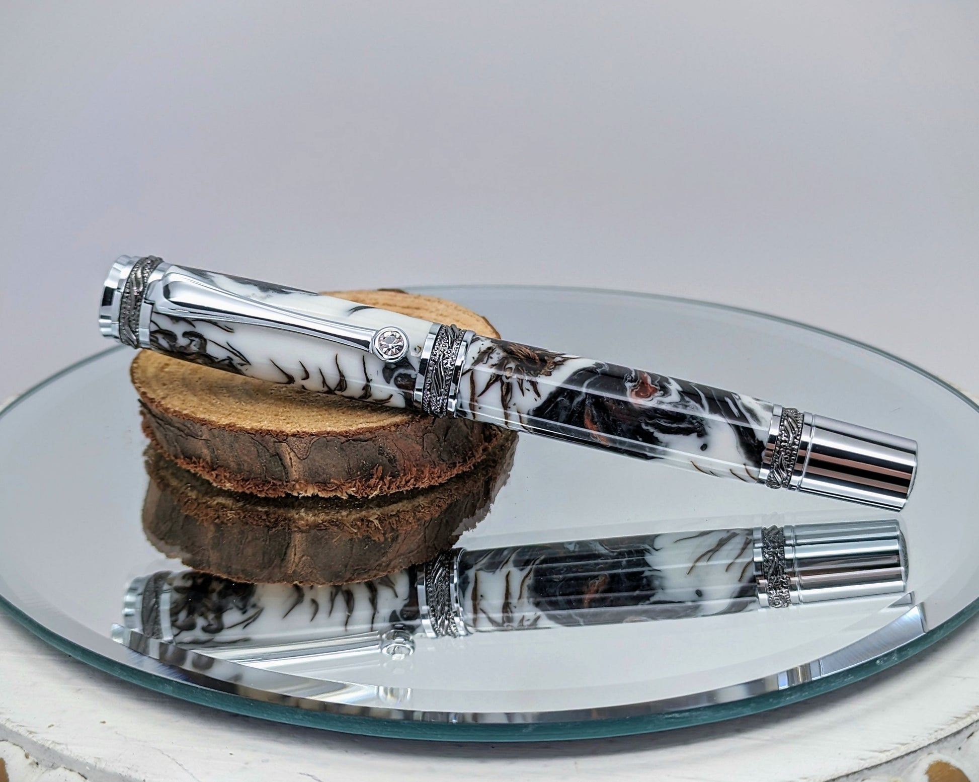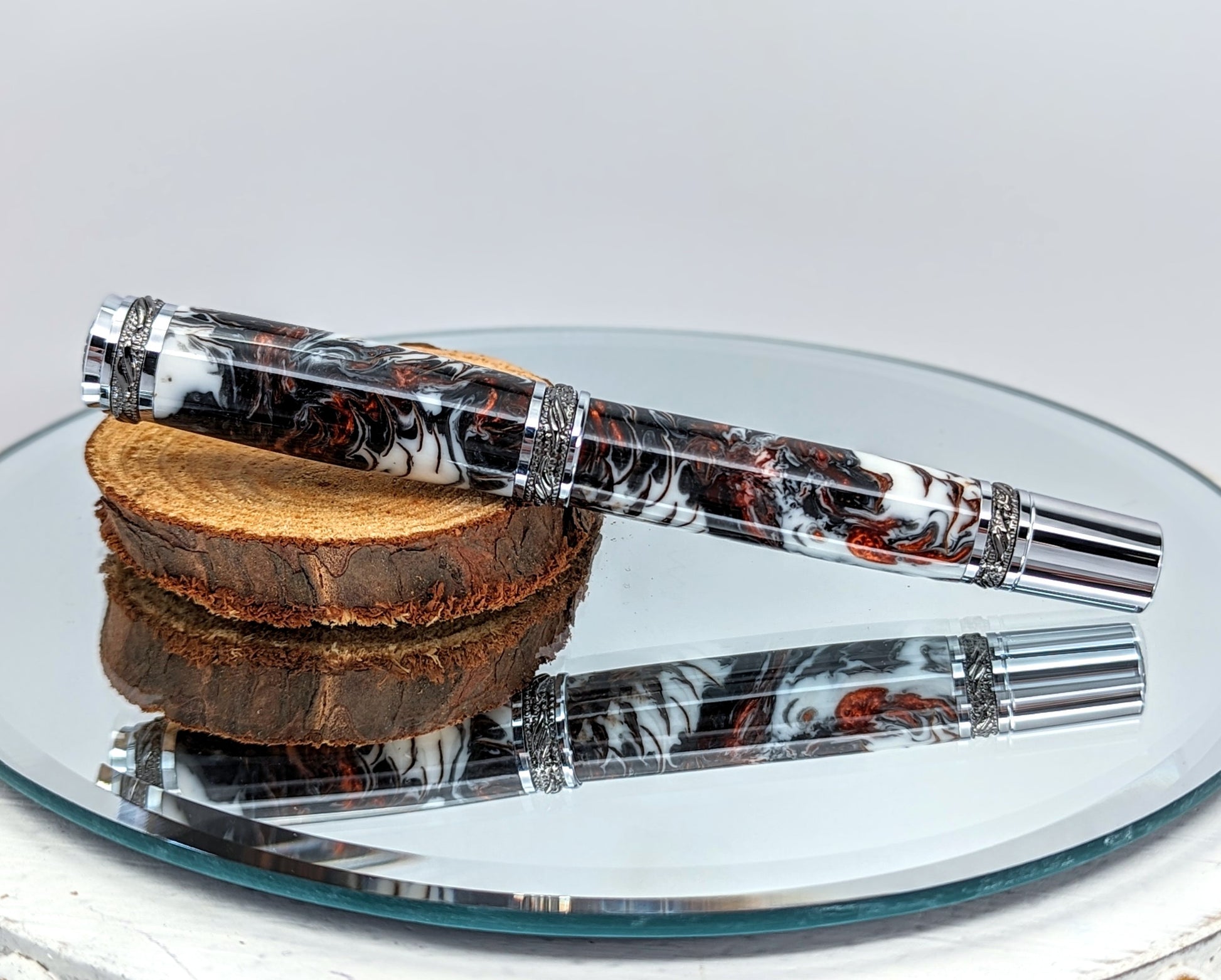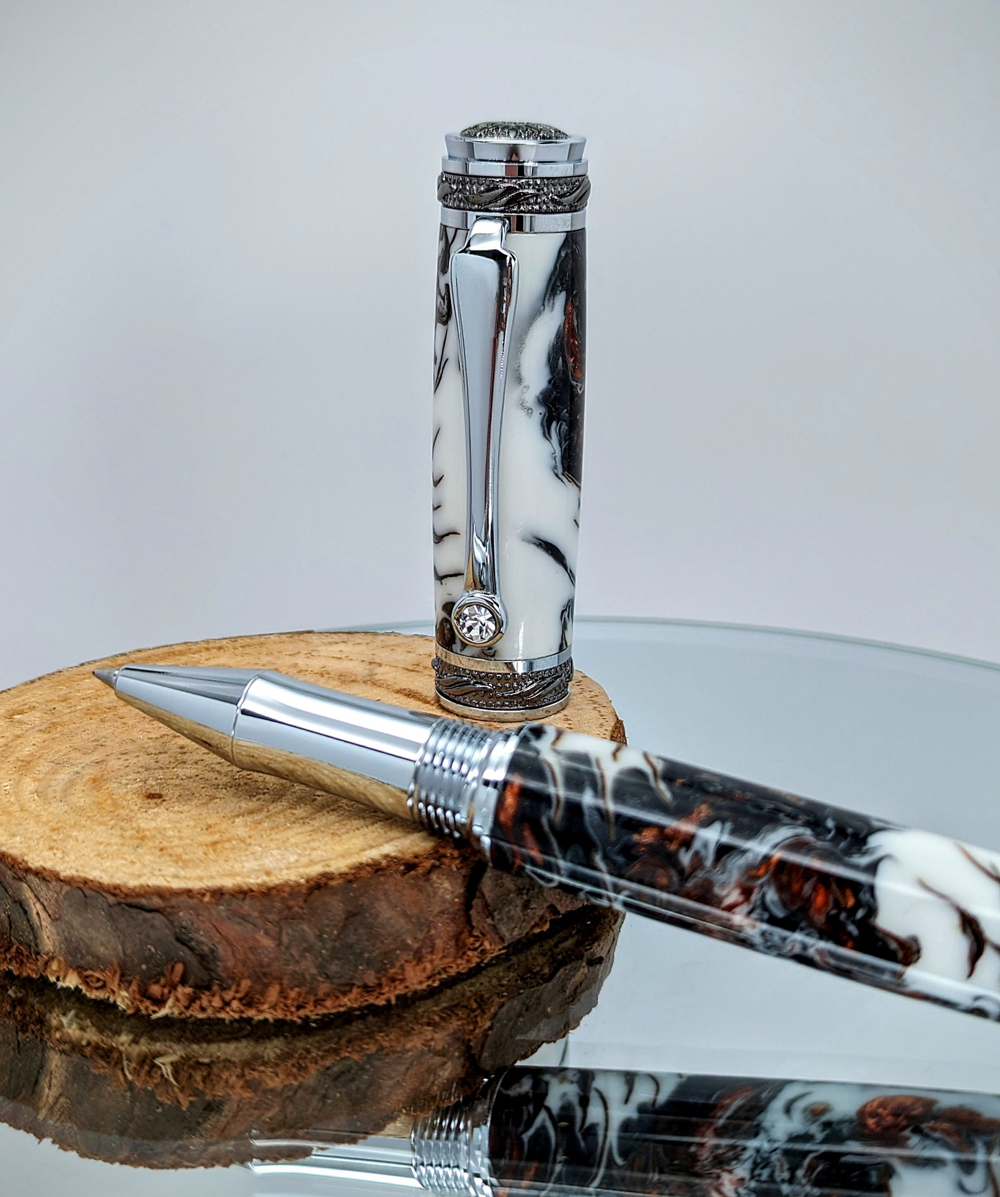 Introducing the Embercone Pen, a unique fusion of natural beauty and exquisite craftsmanship. Each pen is meticulously crafted using real pinecones cast in a blend of white, black, and orange resin, creating a stunning visual masterpiece that captures the essence of nature's allure. Adorned with a sparkling Swarovski clear crystal, this pen exudes elegance and sophistication at every turn. Hand-carved 3-dimensional designs grace all exposed accent rings, bands, and caps, adding a touch of bespoke luxury to its design. Engineered for longevity, each component undergoes a meticulous process of casting, polishing, and plating with durable gun metal, ensuring both durability and refinement. With its regal profile and flawless fit, the Embercone Pen blends natural beauty with timeless elegance.