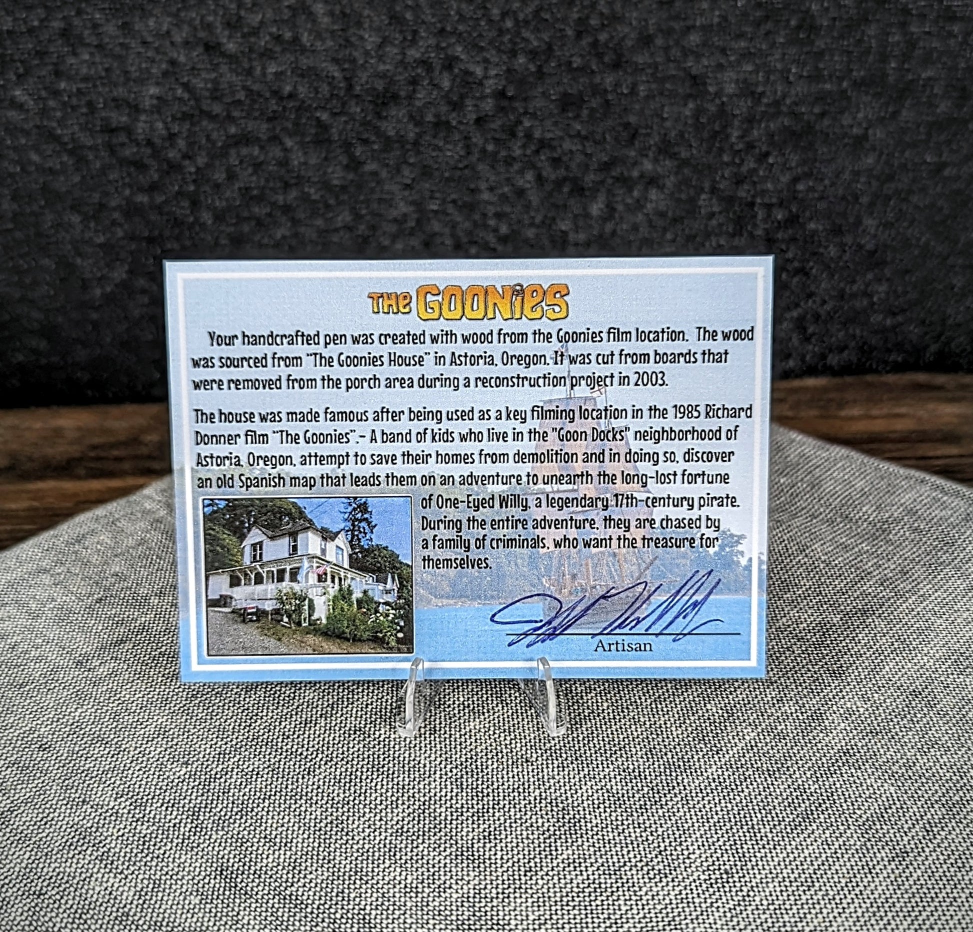 Are you looking for a way to own a one-of-a-kind pen that has a fascinating history? Look no further than this unique writing instrument, created from the wood sourced from "The Goonies House" in Astoria, Oregon. The center of the pen is made out of a genuine Goonies playing card.
