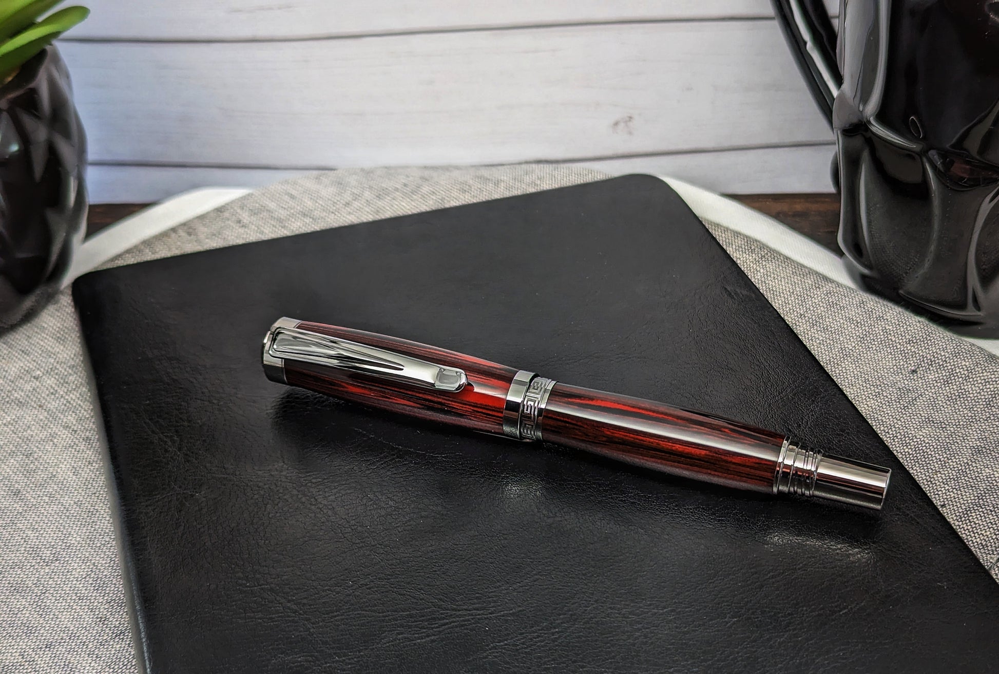 Indulge in the opulent charm and exceptional craftsmanship of a carefully crafted rollerball pen. Painstakingly sculpted from the most exquisite black and red German ebonite, this masterpiece flaunts a tastefully designed Greek Key center band, a comfortably contoured nib, and a gracefully curved cap finial. Adding this ageless treasure into your collection is guaranteed to be a memorable acquisition.