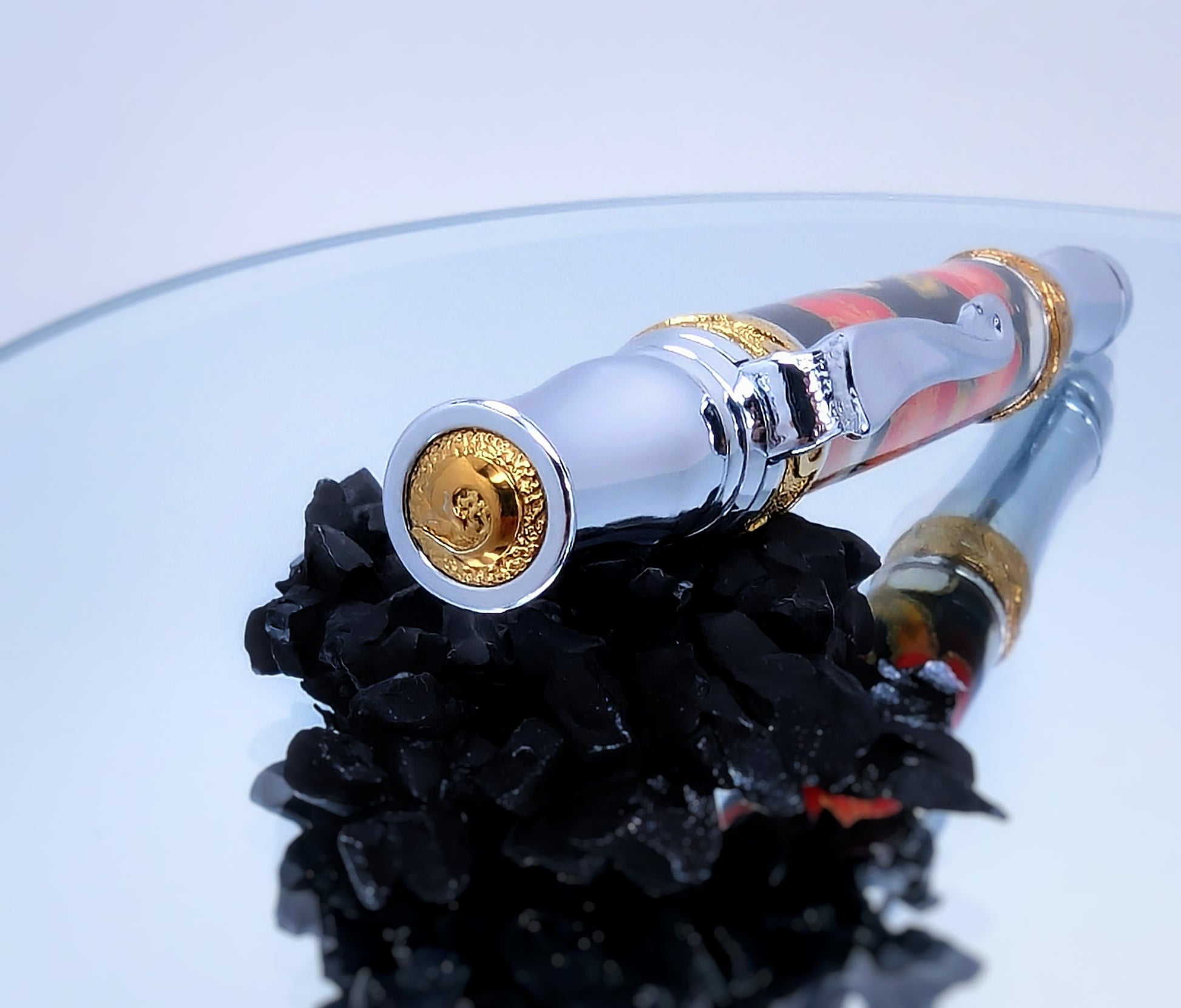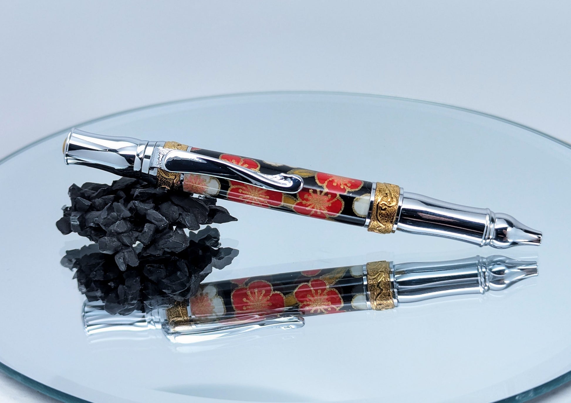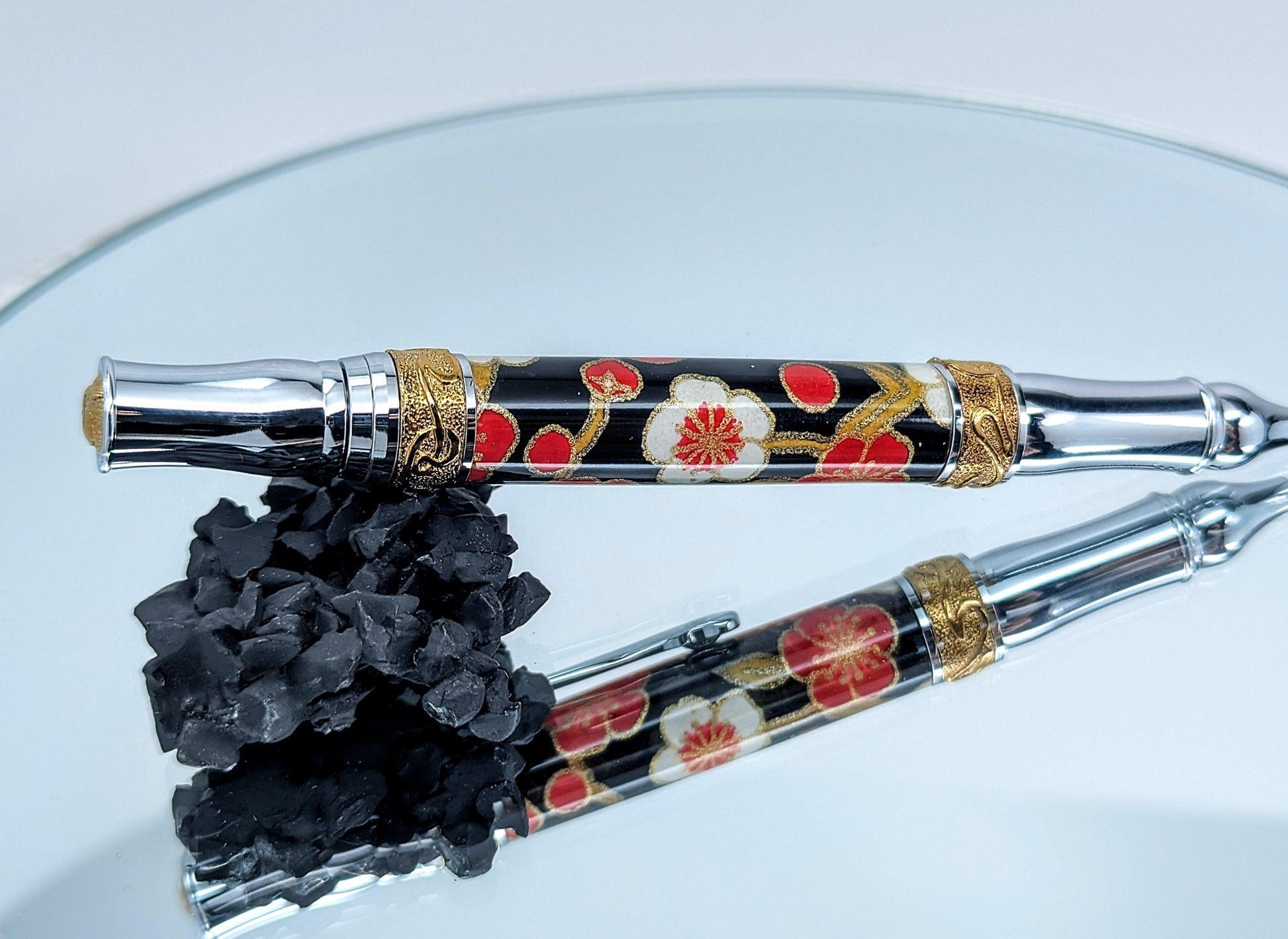 Adorned with delicate red and white flowers on a backdrop of elegant black. Crafted with meticulous attention to detail, this pen merges traditional Japanese artistry with contemporary design. Each fold of the origami paper tells a story of skillful craftsmanship and cultural heritage. As you hold it in your hand, you'll feel the harmony of tradition and modernity, making it not just a writing instrument but a piece of exquisite art. Let your words flow gracefully with this unique fusion of beauty and functionality.