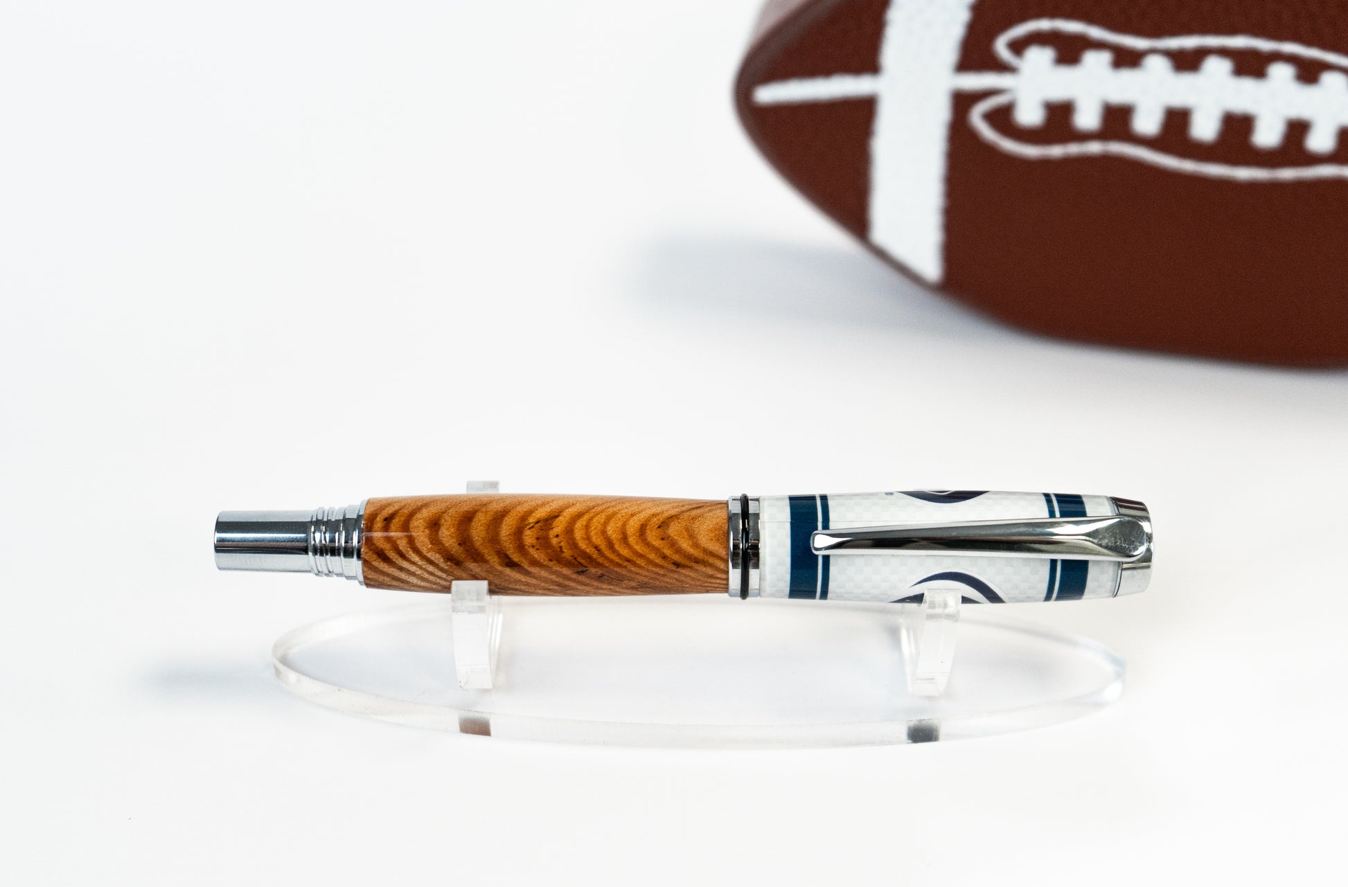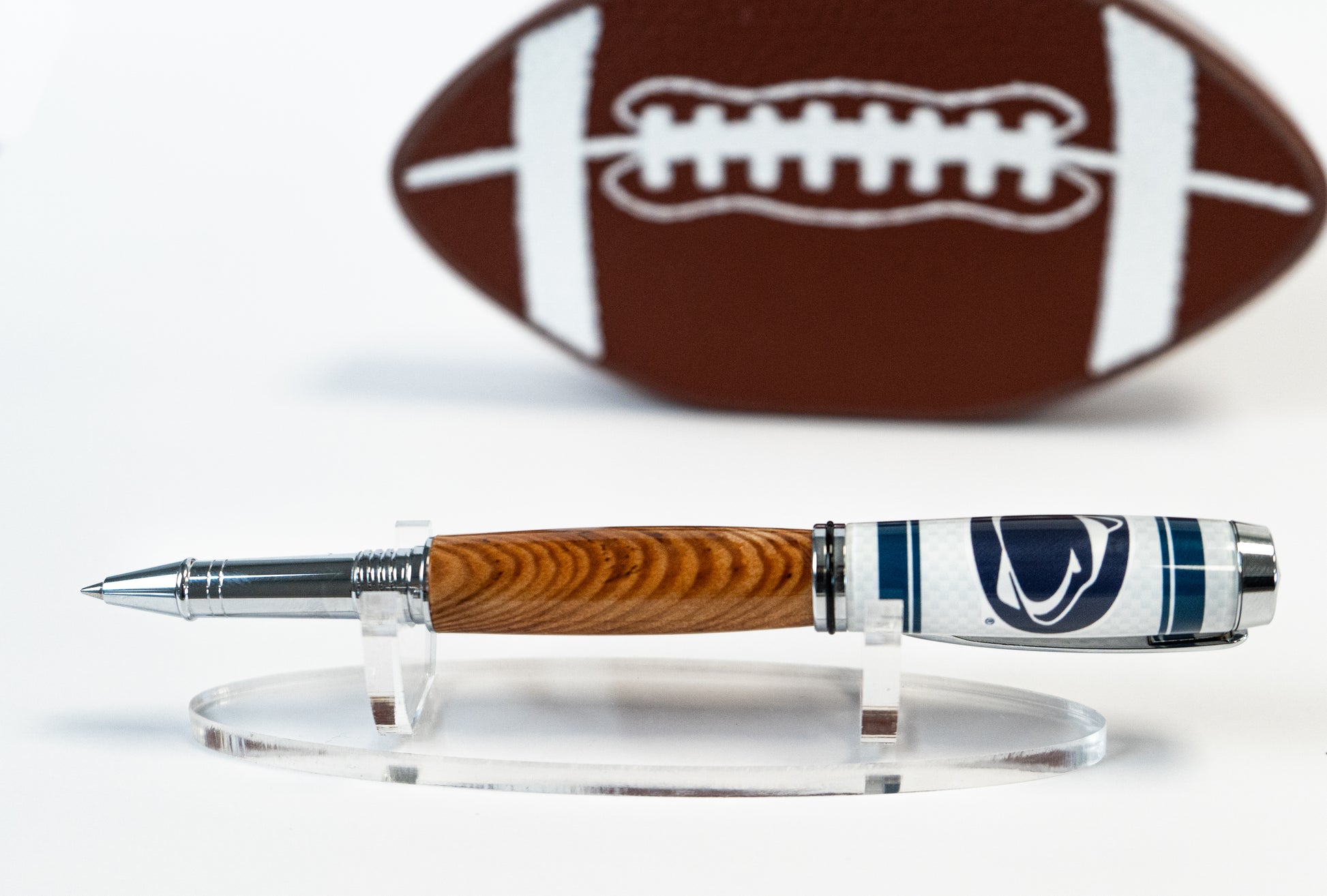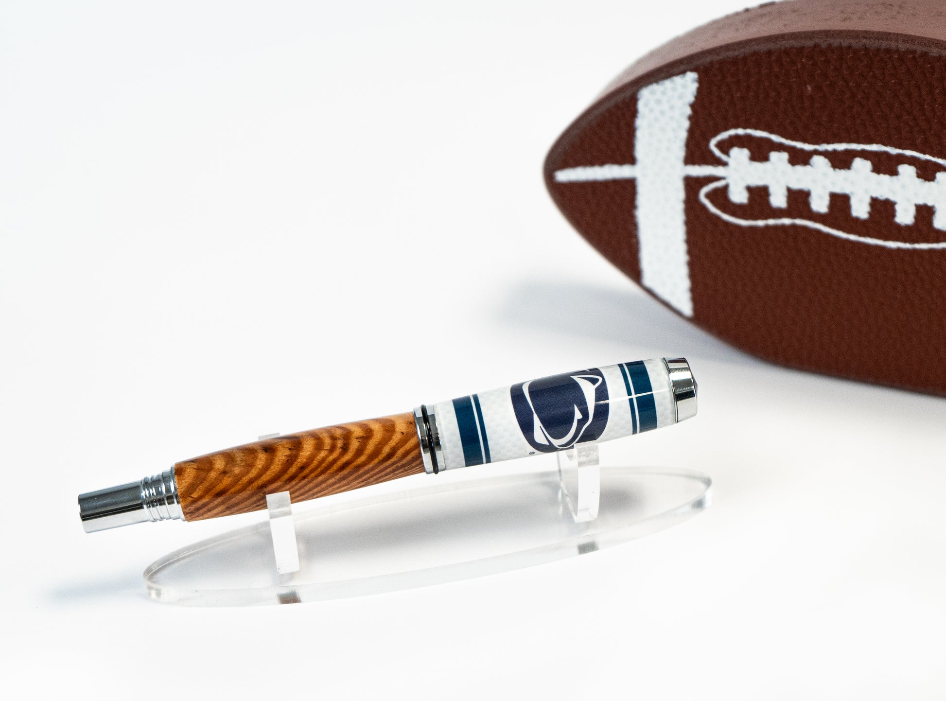 This pen is made with wood from the bleachers at Penn State and a licensed sticker of Ohio State