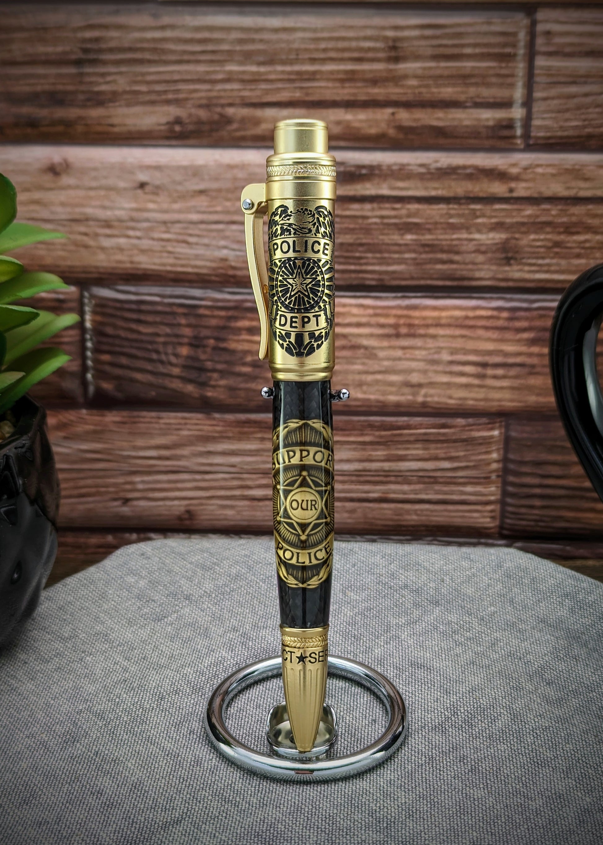 A tribute to the bravery and sacrifice of those who serve and protect us. The pen boasts an intricately designed custom-cast gold medallion and is a testament to the tradition and honor of law enforcement. At the back is a rotary-engraved and enamel-filled detail of a traditional police badge, emblazoned with the words "Police Dept." The pen top features a laser-engraved Coat of Arms symbol, surrounded by commemorative casted laurel branches mirrored on the pen tip. The pen clip is adorned with an enameled Thin Blue line, a symbol of solidarity and support. With its super quiet, smooth action and reliable click mechanism, this pen is more than a writing instrument - it is a source of pride and strength.