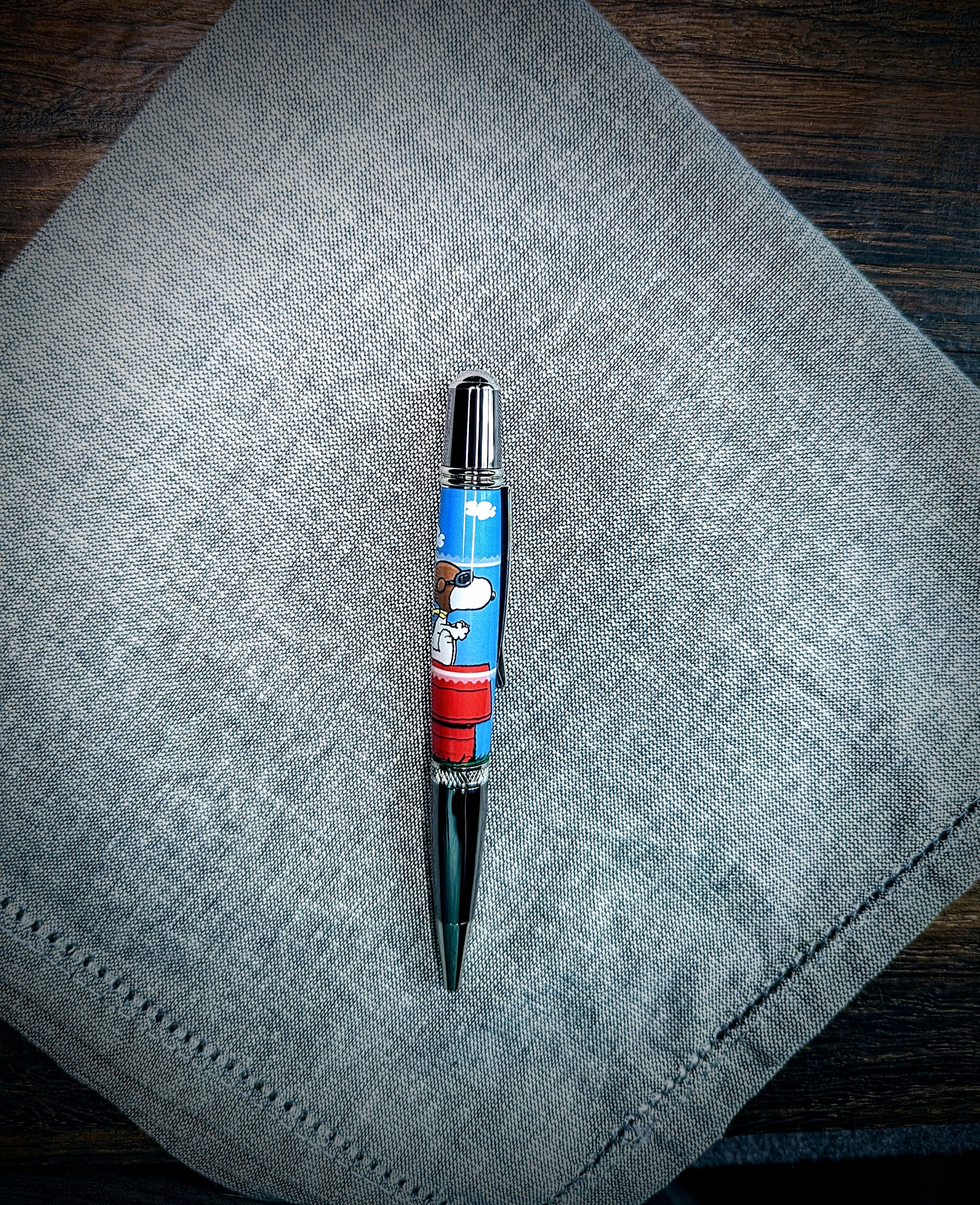 Are you a Snoopy fan? Then you simply can't miss out on this incredible pen! It features a US postage stamp of Snoopy The Flying Ace, complete with a satin silver finish. Take a trip back in time to October 1965, when Snoopy first appeared as the World War I (WWI) Flying Ace in the Peanuts comic strip. With his vivid imagination, he transformed his doghouse into a Sopwith Camel, a British WWI single-seat biplane fighter aircraft, and took on his greatest foe, the Red Baron. This pen is a piece of history that you can own and cherish forever. Show off your love for Snoopy with this amazing pen and let everyone know that you're a true fan!