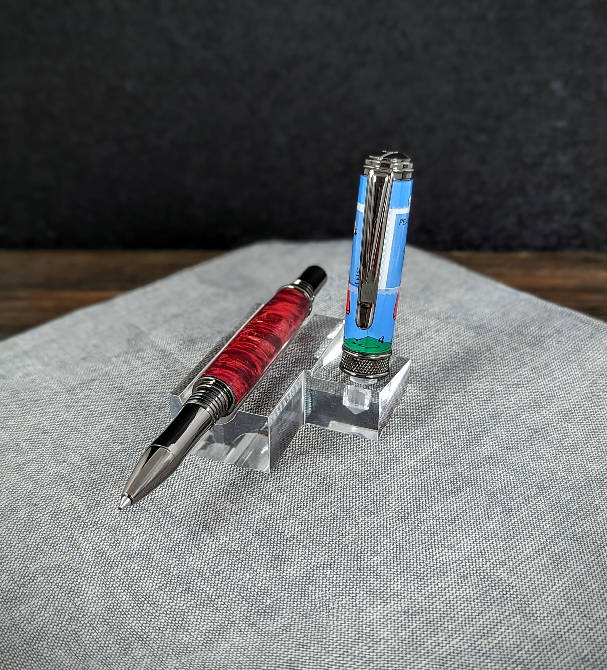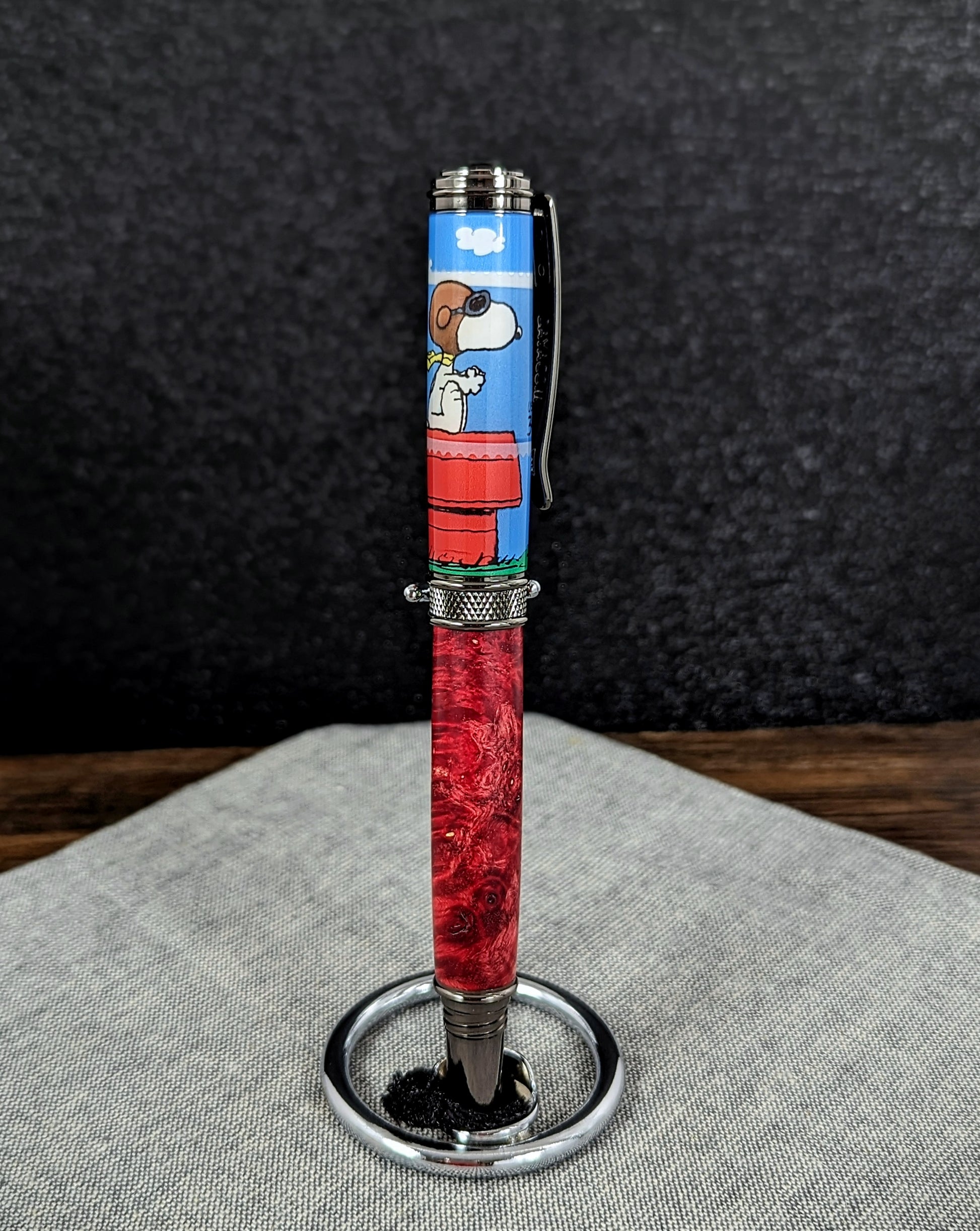 Attention all Snoopy fans! You won't want to miss out on this incredible pen featuring a US postage stamp of Snoopy The Flying Ace, complete with a sleek gunmetal finish. Transport yourself back to October 1965, when Snoopy first appeared as the World War I (WWI) Flying Ace in the Peanuts comic strip. With his vivid imagination, he transformed his doghouse into a Sopwith Camel, a British WWI single-seat biplane fighter aircraft, and took on his greatest foe, the Red Baron. Don't miss your chance to own a piece of history and show off your love for Snoopy with this amazing pen!