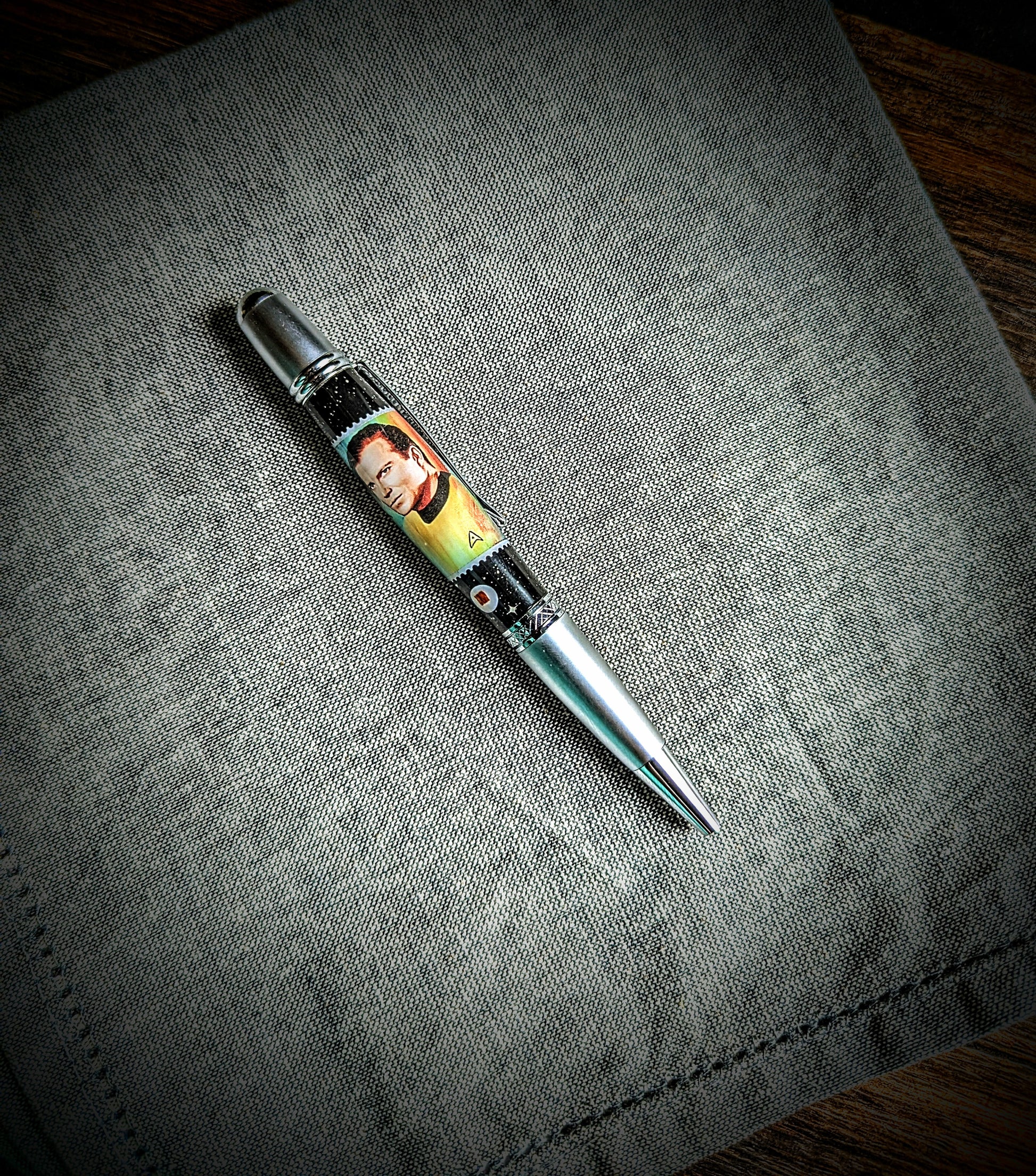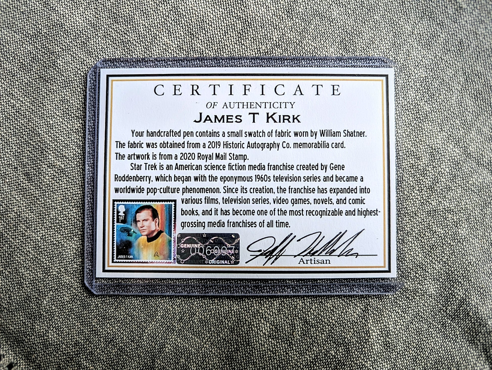 The fabric from William Shatner was sourced from a 2019 Historic Autograph Co. memorabilia card. This unique inclusion makes the pen a treasured item for any Star Trek fan, blending utility with a deep connection to the beloved sci-fi series.