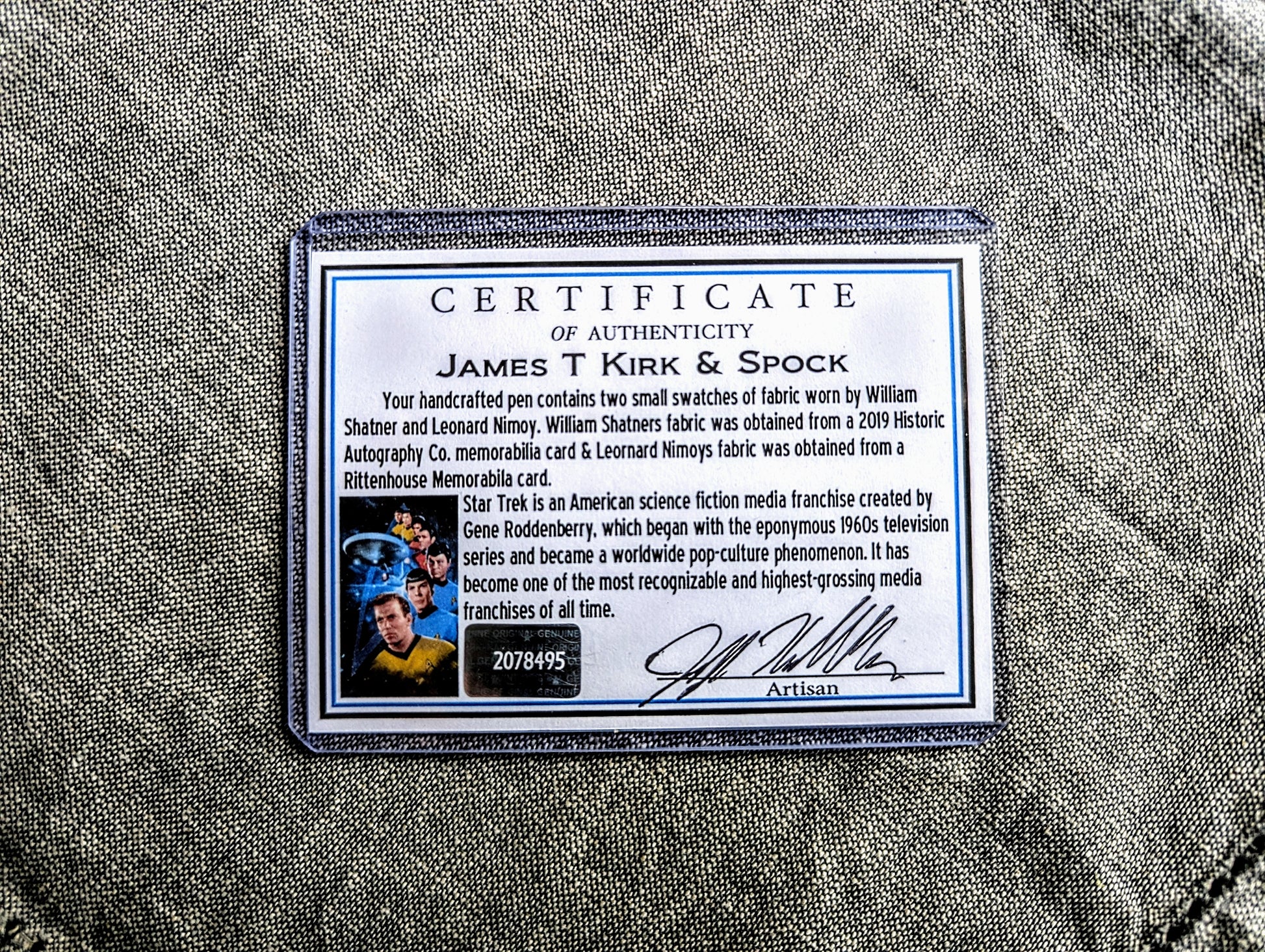 The fabric from William Shatner was sourced from a 2019 Historic Autograph Co. memorabilia card, while the fabric from Leonard Nimoy was obtained from a Rittenhouse Memorabilia card. These unique inclusions make the pen a treasured item for any Star Trek fan, blending utility with a deep connection to the beloved sci-fi series.