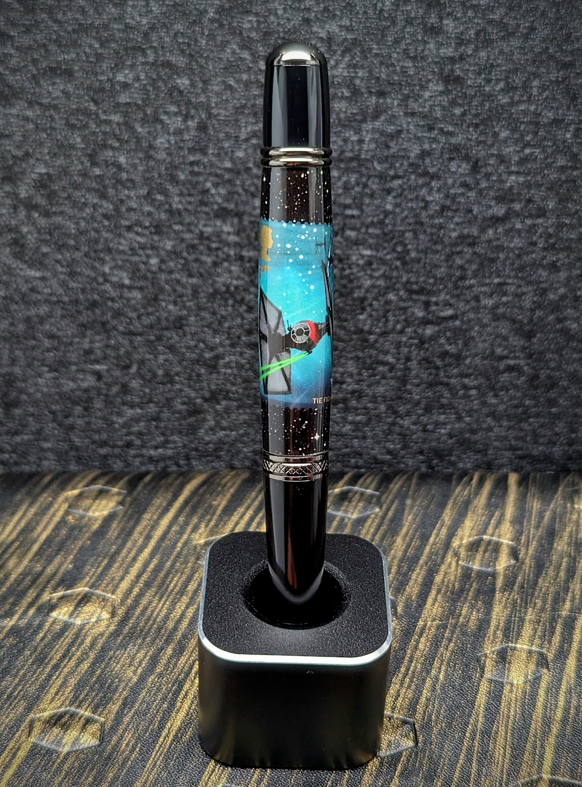 Crafted with the precision of a Jedi's lightsaber, this pen is not just a writing instrument; it's a collector's item for the true Star Wars aficionado. At its heart lies a genuine postage stamp issued by the Royal Mail in 2015, showcasing the iconic Black TIE Fighter piloted by the formidable Darth Vader himself.