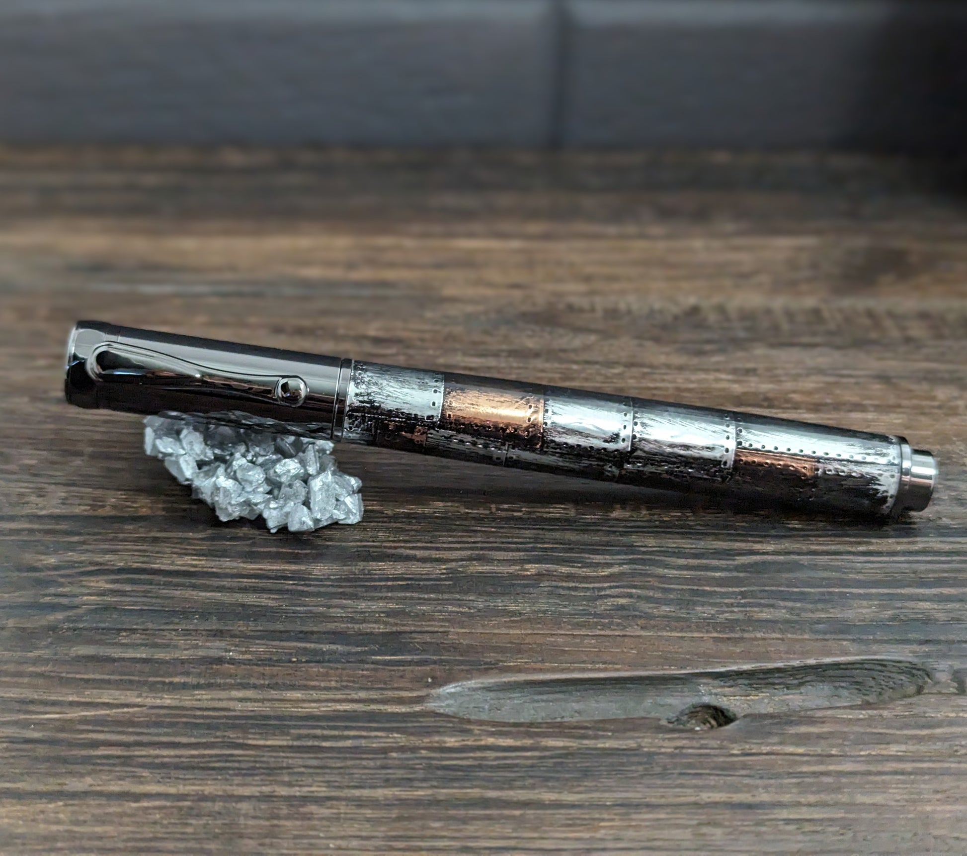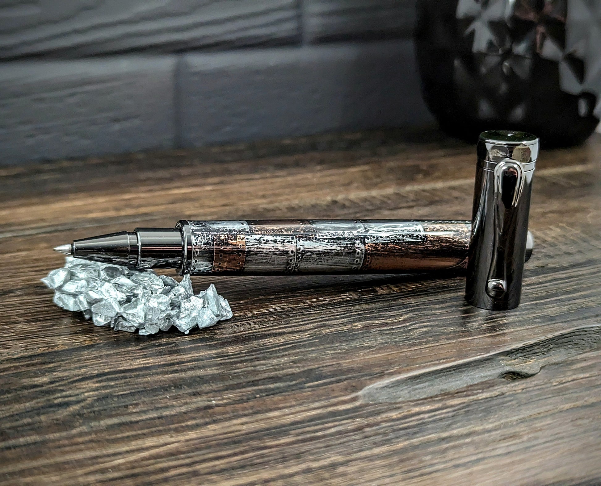 Introducing our sleek pen with a magnetic cap and gun metal finish, accented by hand-stamped metal pieces. It's stylish, durable, and uniquely crafted for every user. Elevate your writing experience with this statement of style and practicality.