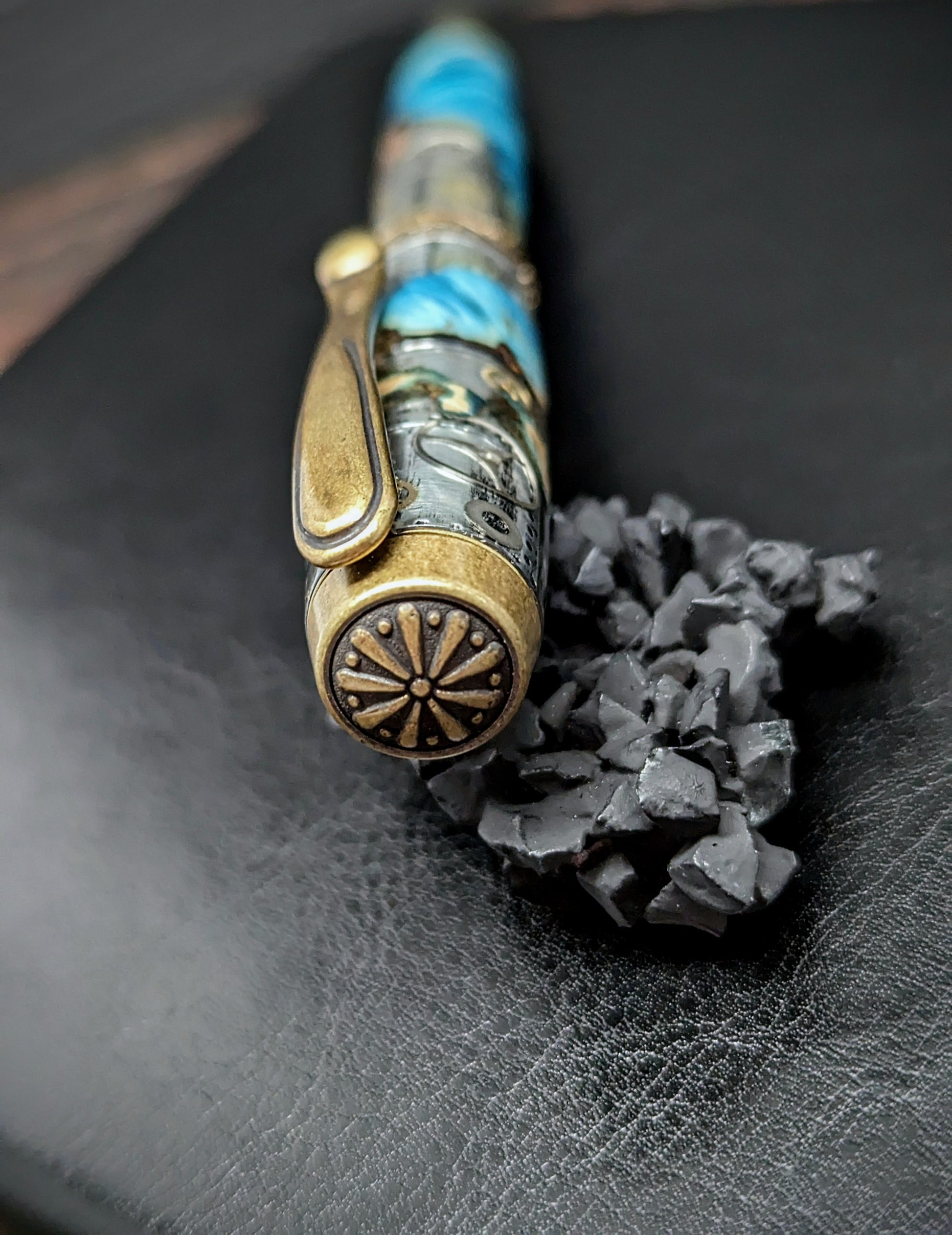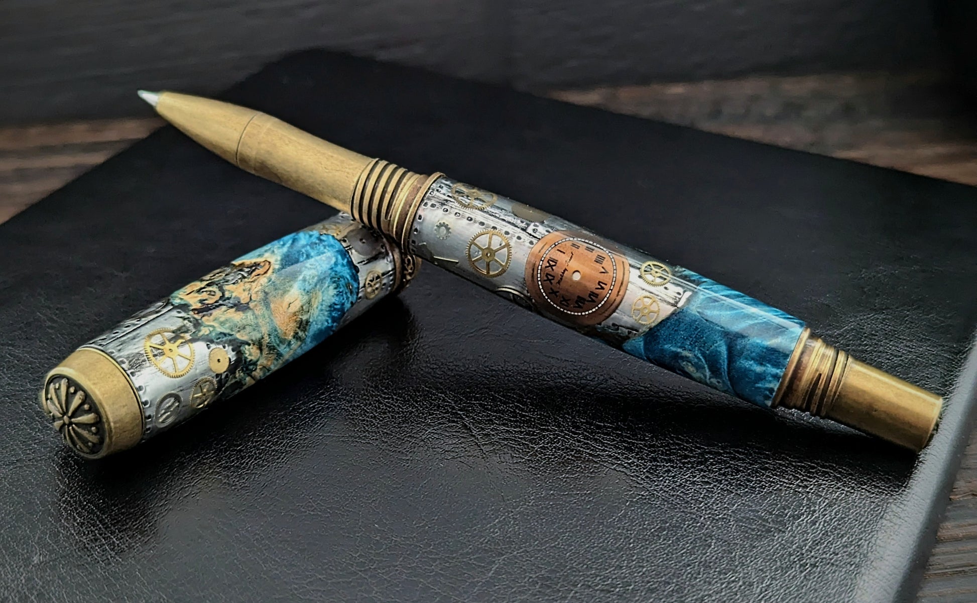 Crafted from burl wood dyed blue, adorned with hand-placed clockwork pieces, and antique bass metal components, it's a masterpiece of style and function. With each stroke, you'll feel the weight of history and the thrill of creativity. Own a piece of the past, and let your words flow like the gears of time with this extraordinary pen.