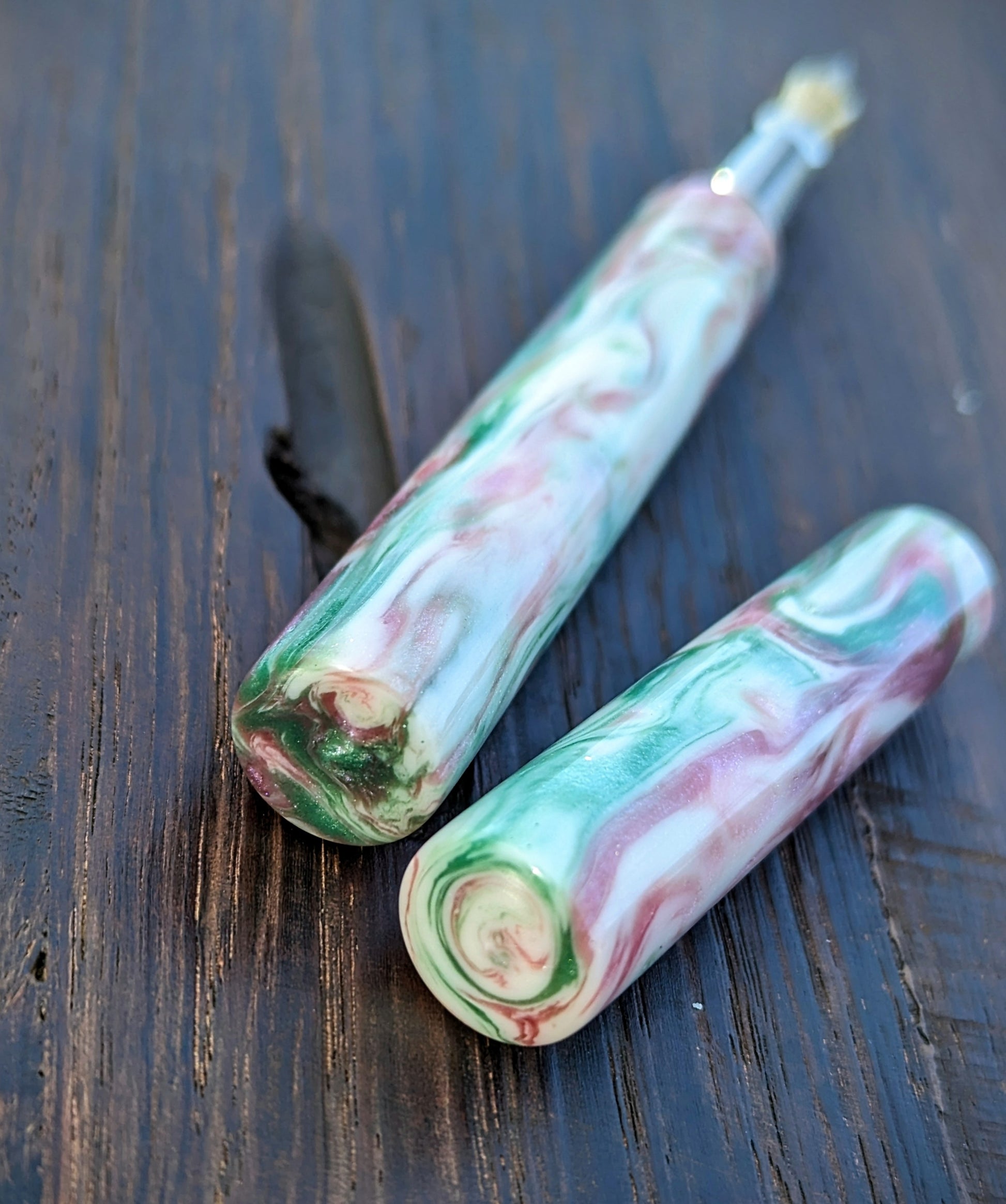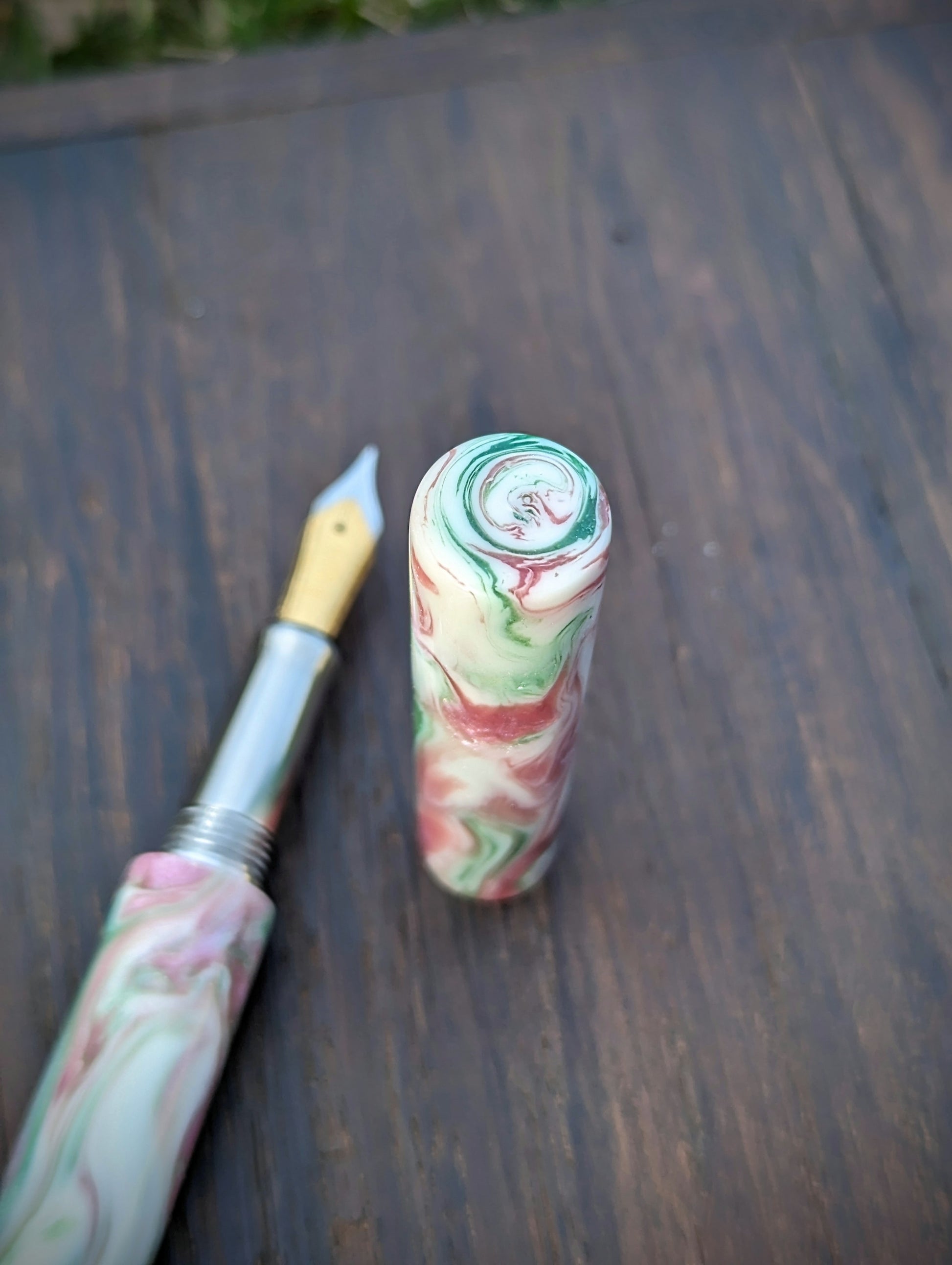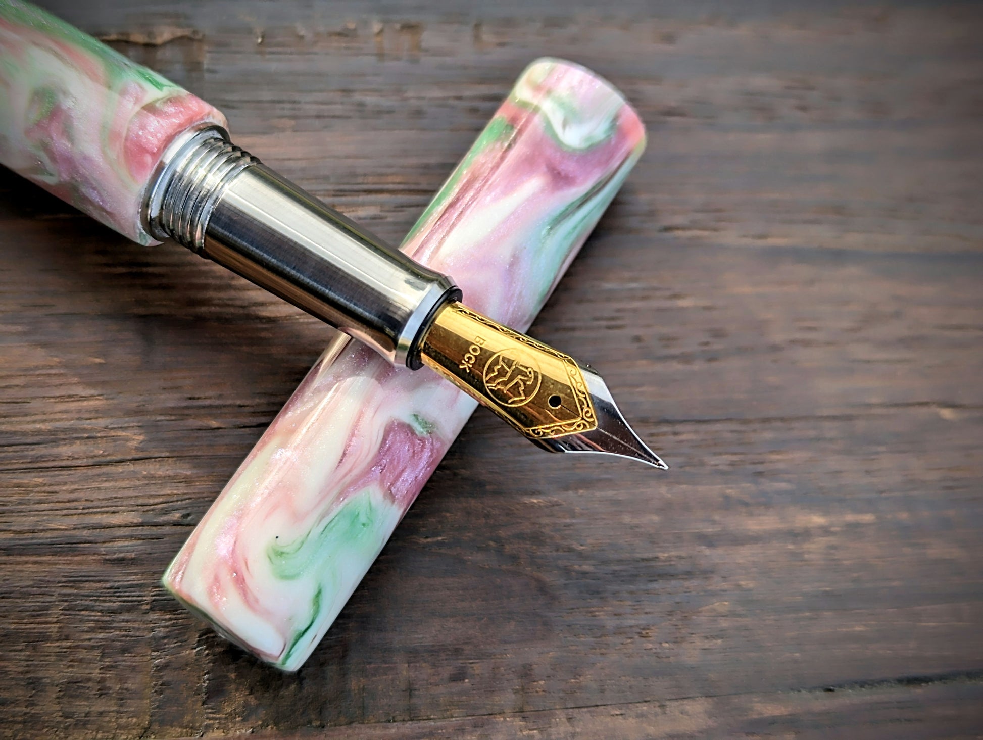 Elevate your writing game with this exquisite fountain pen! Crafted with precision, it boasts a durable stainless steel grip section for ultimate comfort and control. The heart of this beauty lies in its top-notch number 6 Bock nib, ensuring each stroke glides effortlessly on paper. But what truly sets it apart is its stunning body – a kaleidoscope of colors! Picture swirling shades of pink, green, and cream, captured in shimmering resin, making every word you write a work of art. Whether you're a seasoned writer or just starting your collection, this pen is a must-have for anyone who appreciates the finer things in life. Don't just write, make a statement!