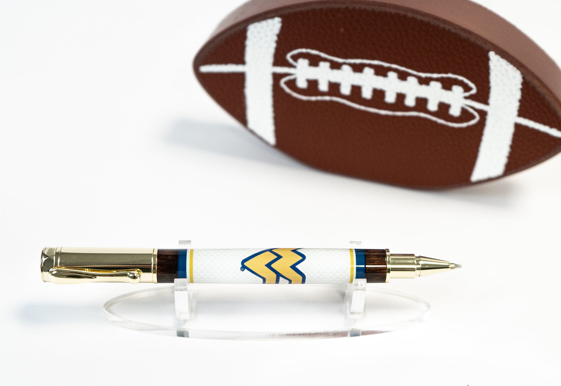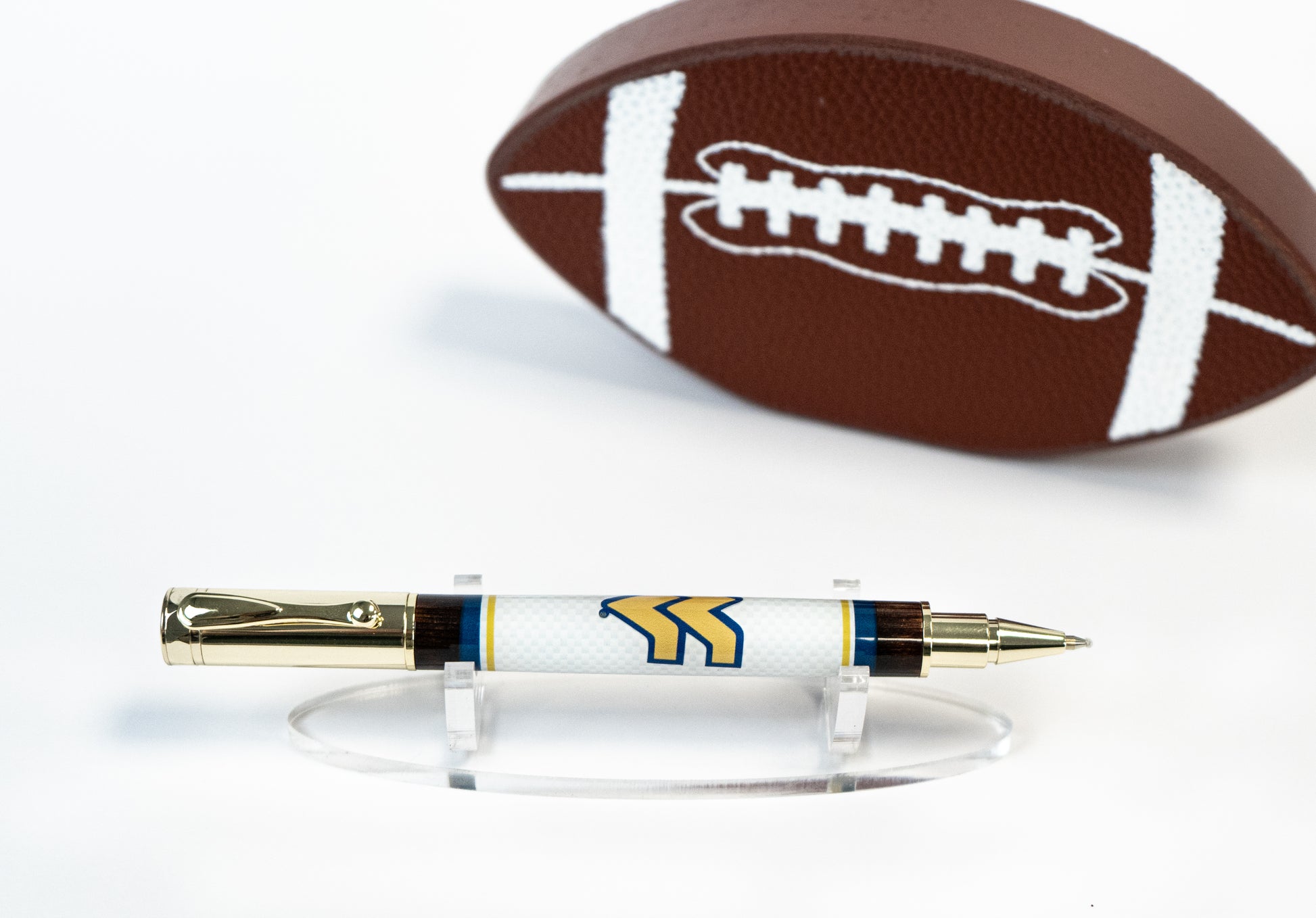 This pen is made with wood from the bleachers at WV Stadium and a licensed sticker of West Virginia