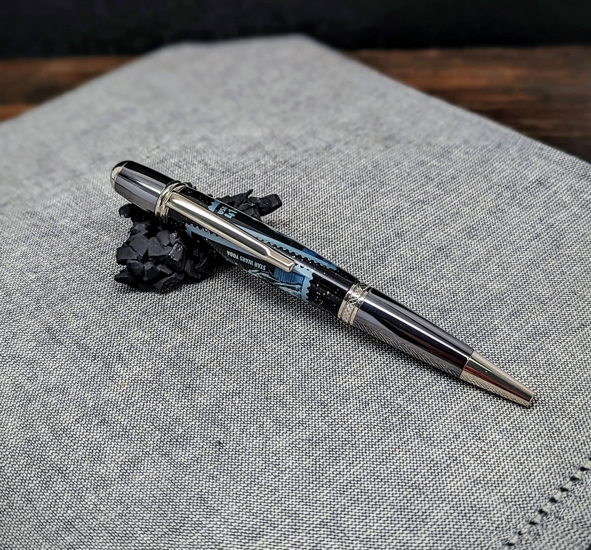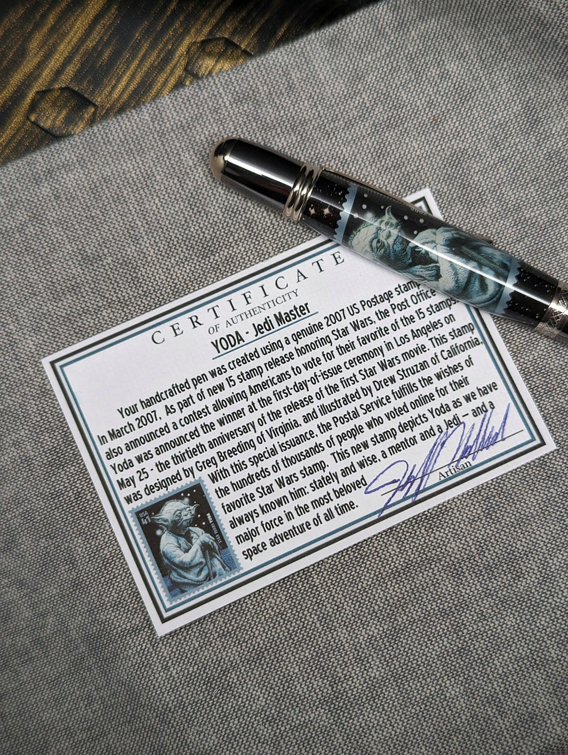 Star Wars enthusiasts, this pen is a must-have in your collection. It's made from a genuine US Mail foil stamp featuring Yoda in a specially commissioned illustration. The modern and sleek Diamond Knurl design with a gunmetal finish is eye-catching and perfect for standing out in any crowd. The shimmering effect in the light adds even more allure to its already captivating design. Making it a valuable addition to your collection.